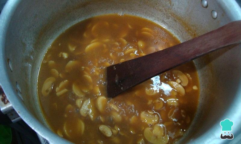 Adicione os cogumelos, o caldo de carne e o vinho. Tempere com sal e pimenta do reino e deixe engrossar, mexendo de vez em quando.