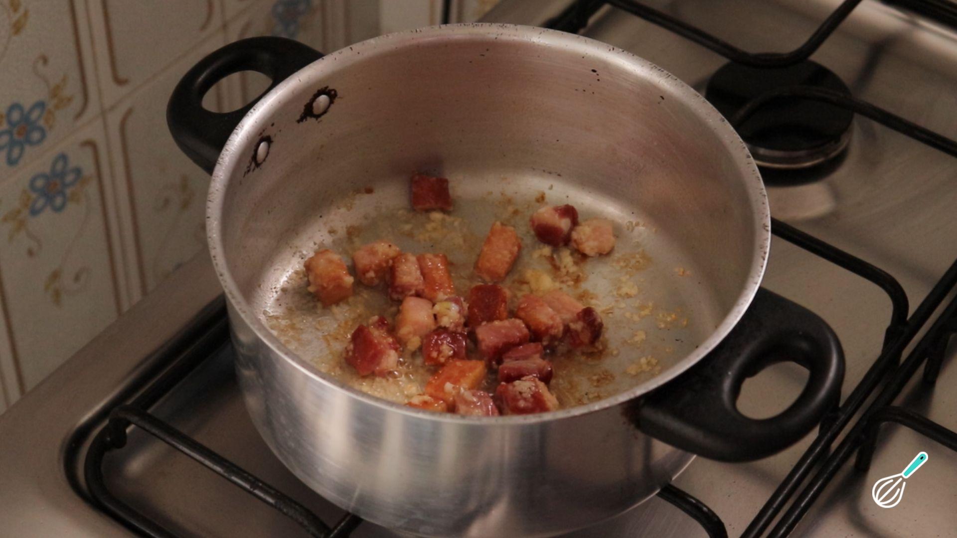 Em uma panela, doure o bacon com o azeite. Em seguida adicione a cebola e o alho e refogue.