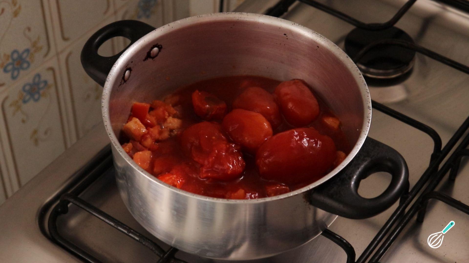 Assim que o tomate murchar, coloque as lata de tomate pelado.