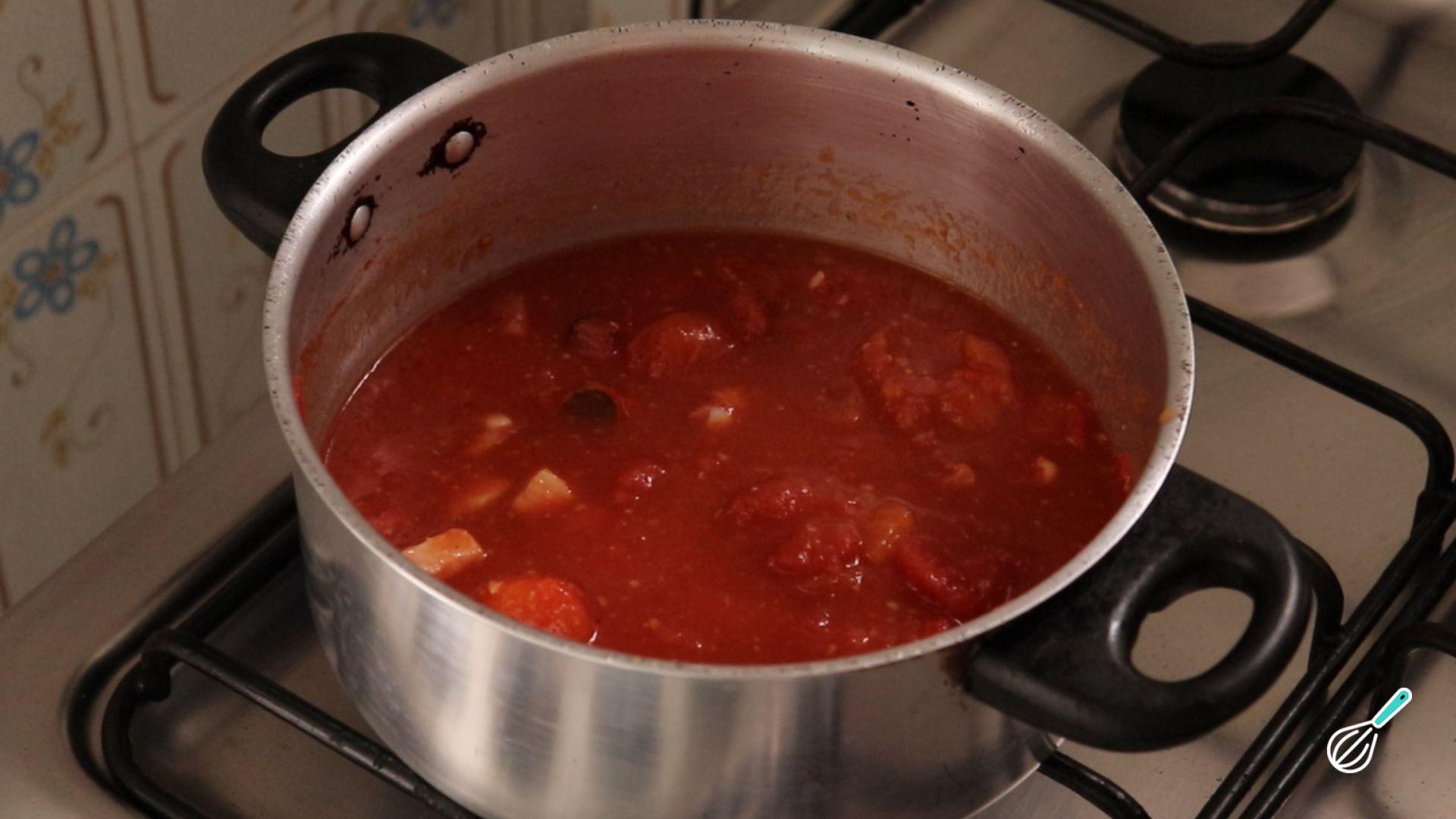 Tempere com pimenta e sal a gosto. Finalize com o açúcar para tirar a acidez e cozinhe em fogo baixo, por 30 minutos - mexa de vez em quando e, se necessário, adicione uma concha de água fervente.