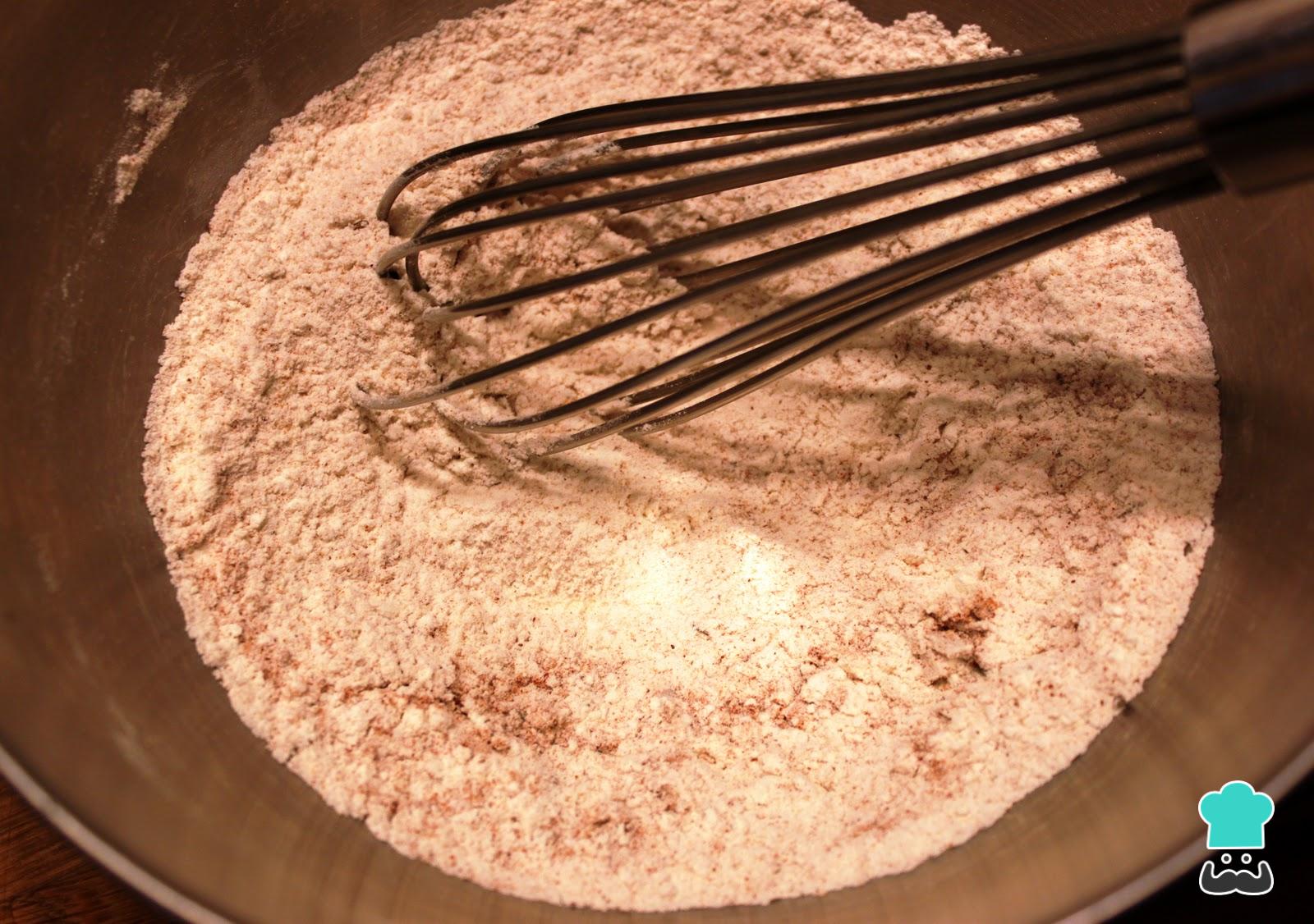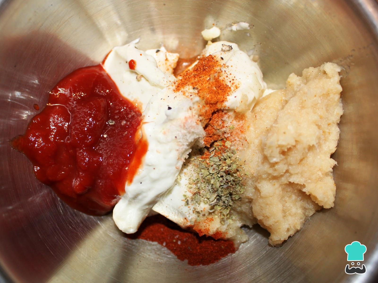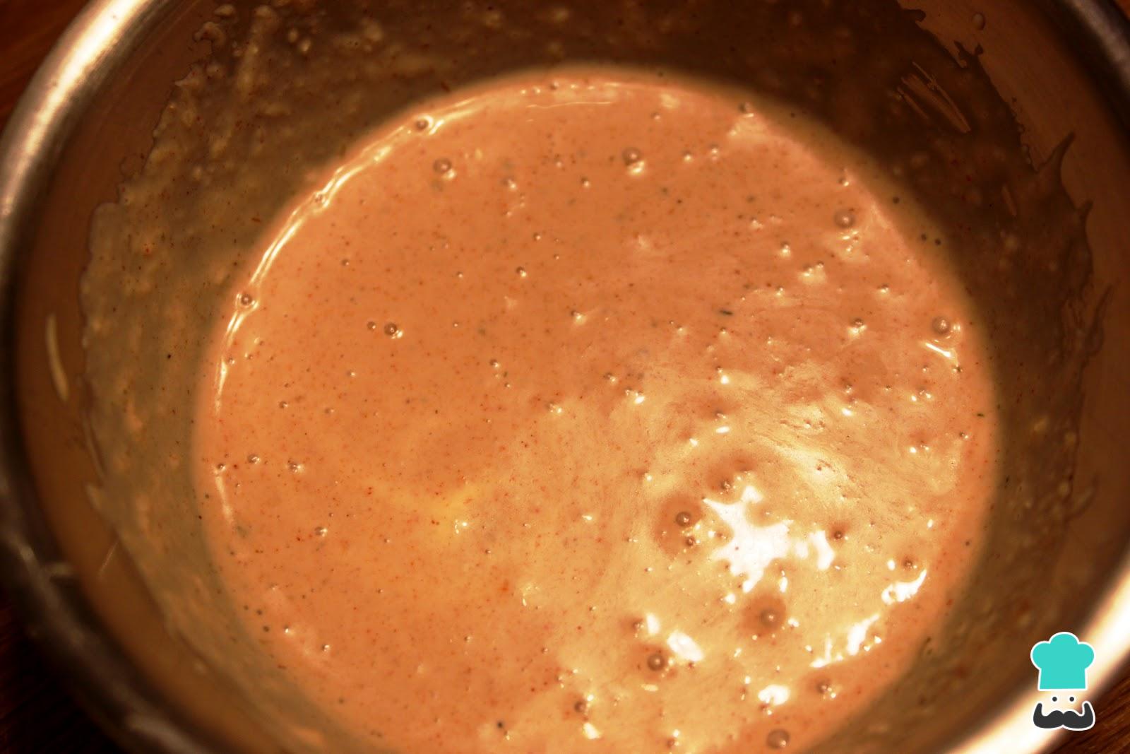 É muito simples preparar este molho rosa para cebola empanada! Comece por misturar os ingredientes secos em uma tigela.
