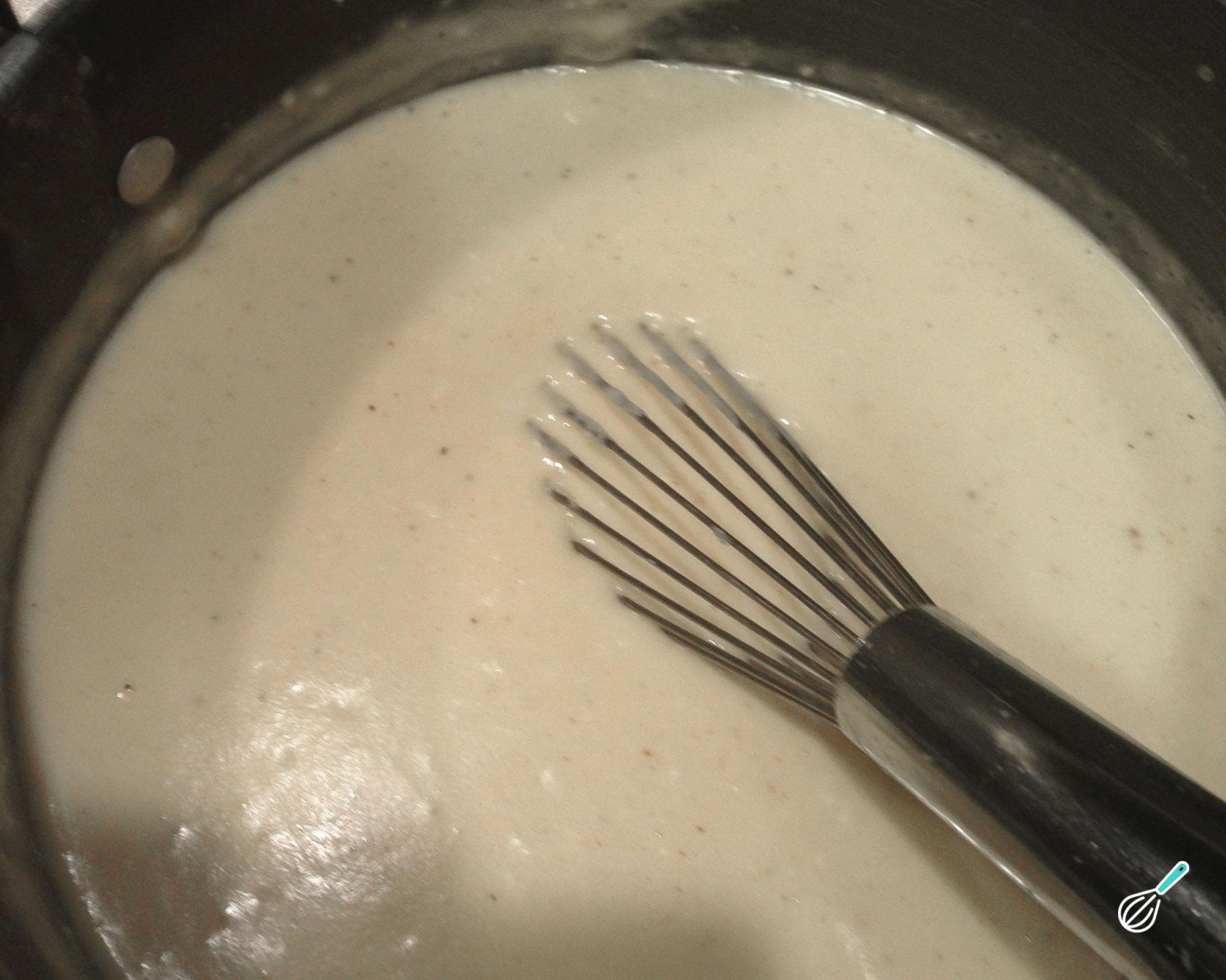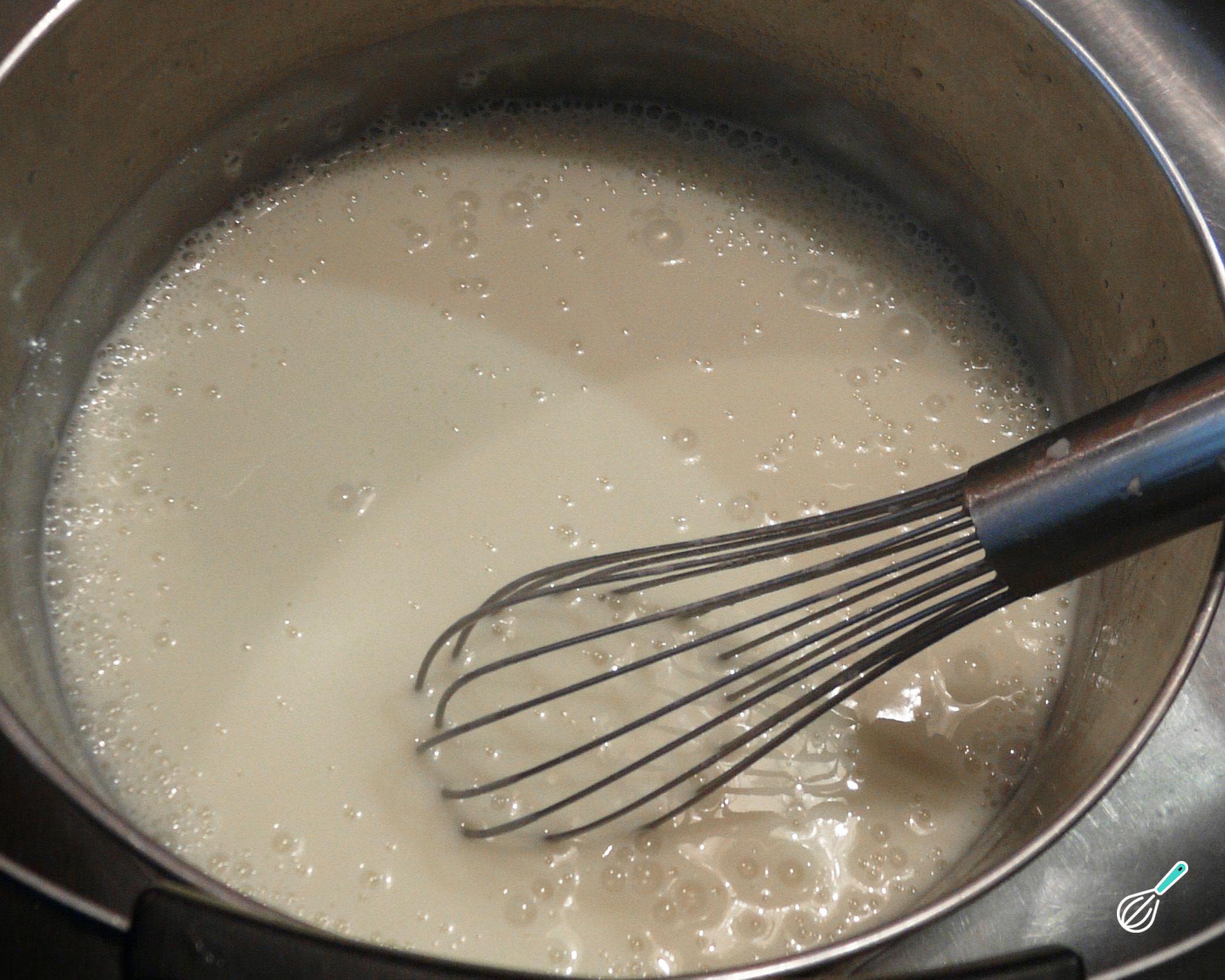 De seguida, dissolva o amido de milho no leite e coloque na panela. Adicione também o tablete de caldo e o shoyu e fique mexendo no fogo médio até esse molho branco engrossar.
