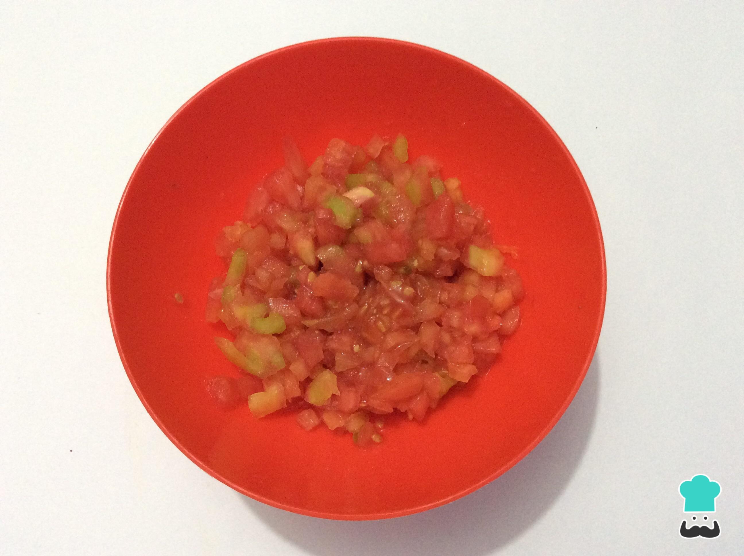 Lave bem e retire a pele dos tomates (para fazer isso facilmente, faça um corte em forma de cruz neles e coloque-os em água fervente por 5 minutos). Rejeite as sementes e corte os tomates em cubos pequenos.