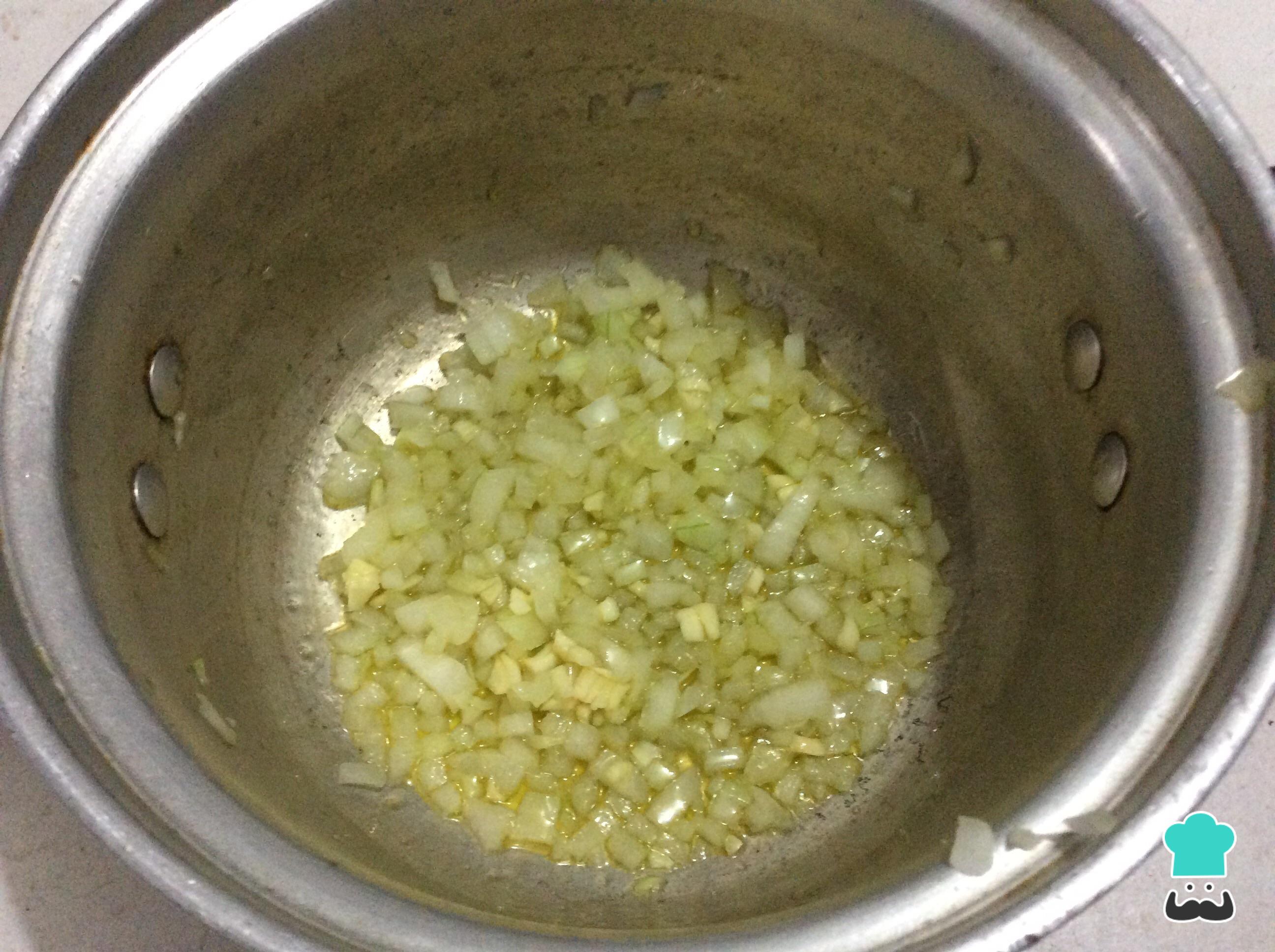 O próximo passo do molho pomodoro é levar ao fogo médio uma panela com um pouco de azeite. Quando estiver quente, acrescente a cebola e o alho finamente picados, cozinhe por 3 minutos e tempere com sal e pimenta a gosto.