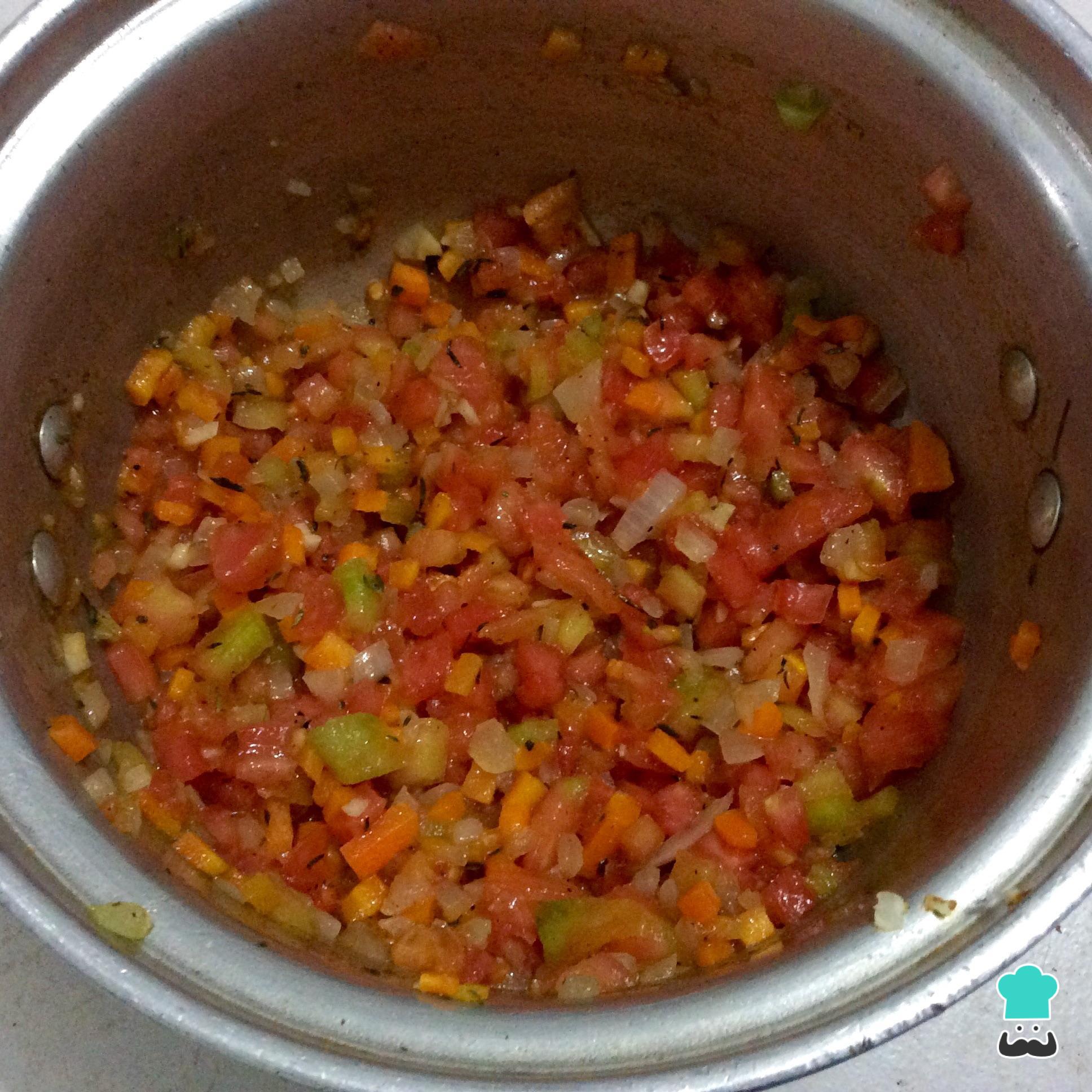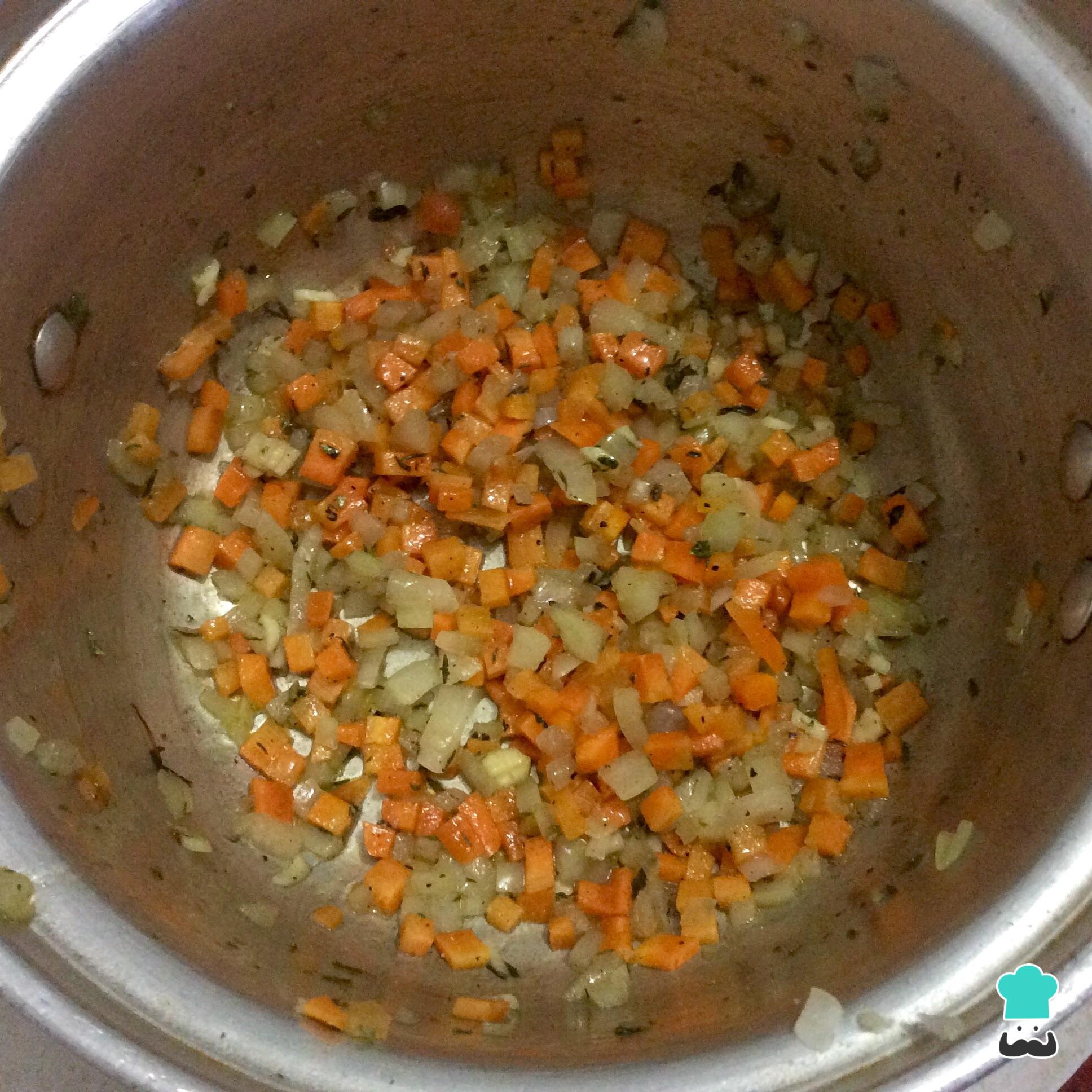 Após o tempo indicado, acrescente a cenoura descascada e cortada cubos muito pequenos. Cozinhe por mais 3 minutos e adicione pimenta e tomilho a gosto.