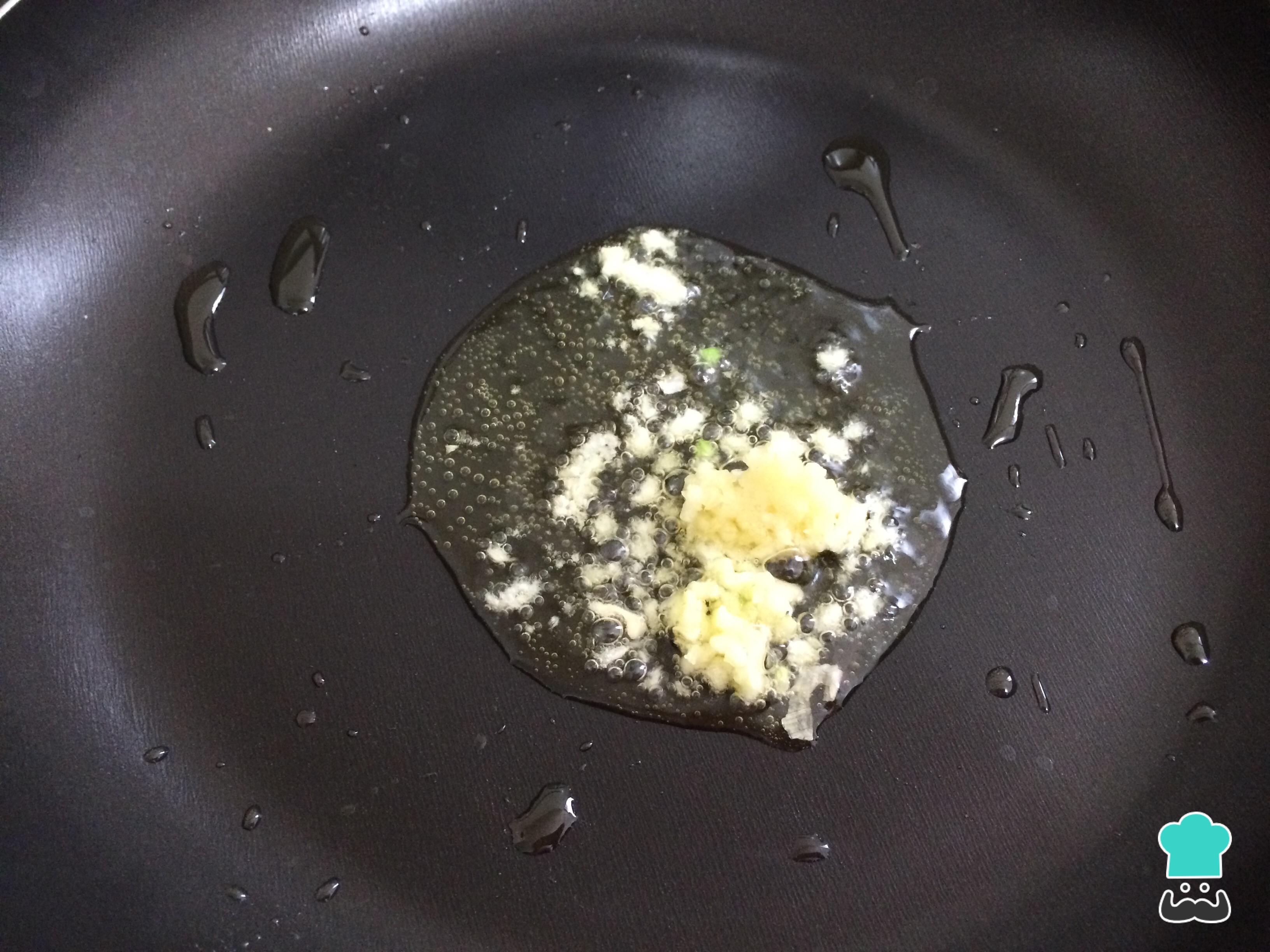 Em uma frigideira com o azeite em fogo baixo, refogue os alhos cortados finamente por 1 minuto.