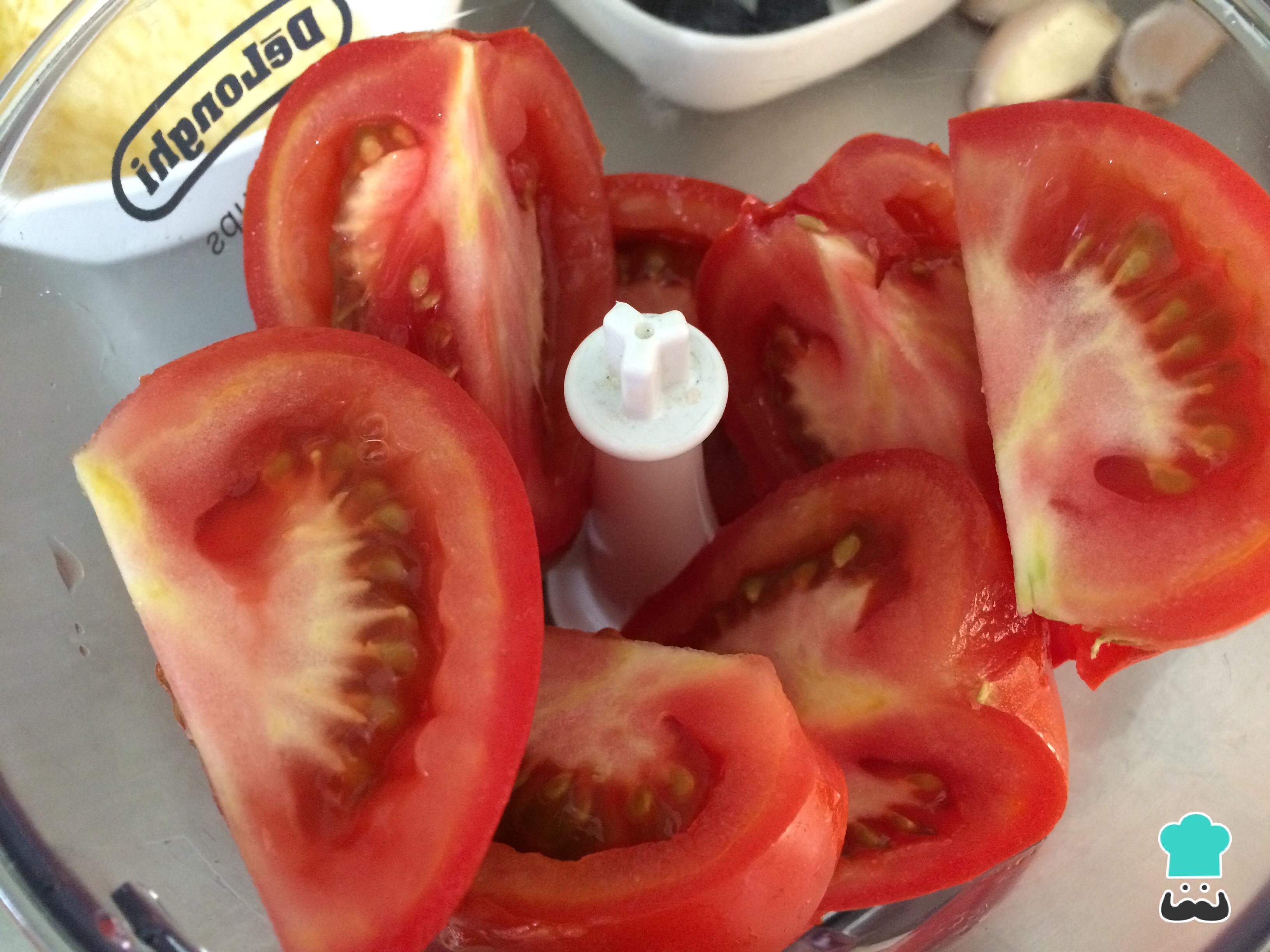 Enquanto isso, lave os tomates e bata-os no liquidificador ou processador com um pouco de água, até obter um purê não totalmente liso.