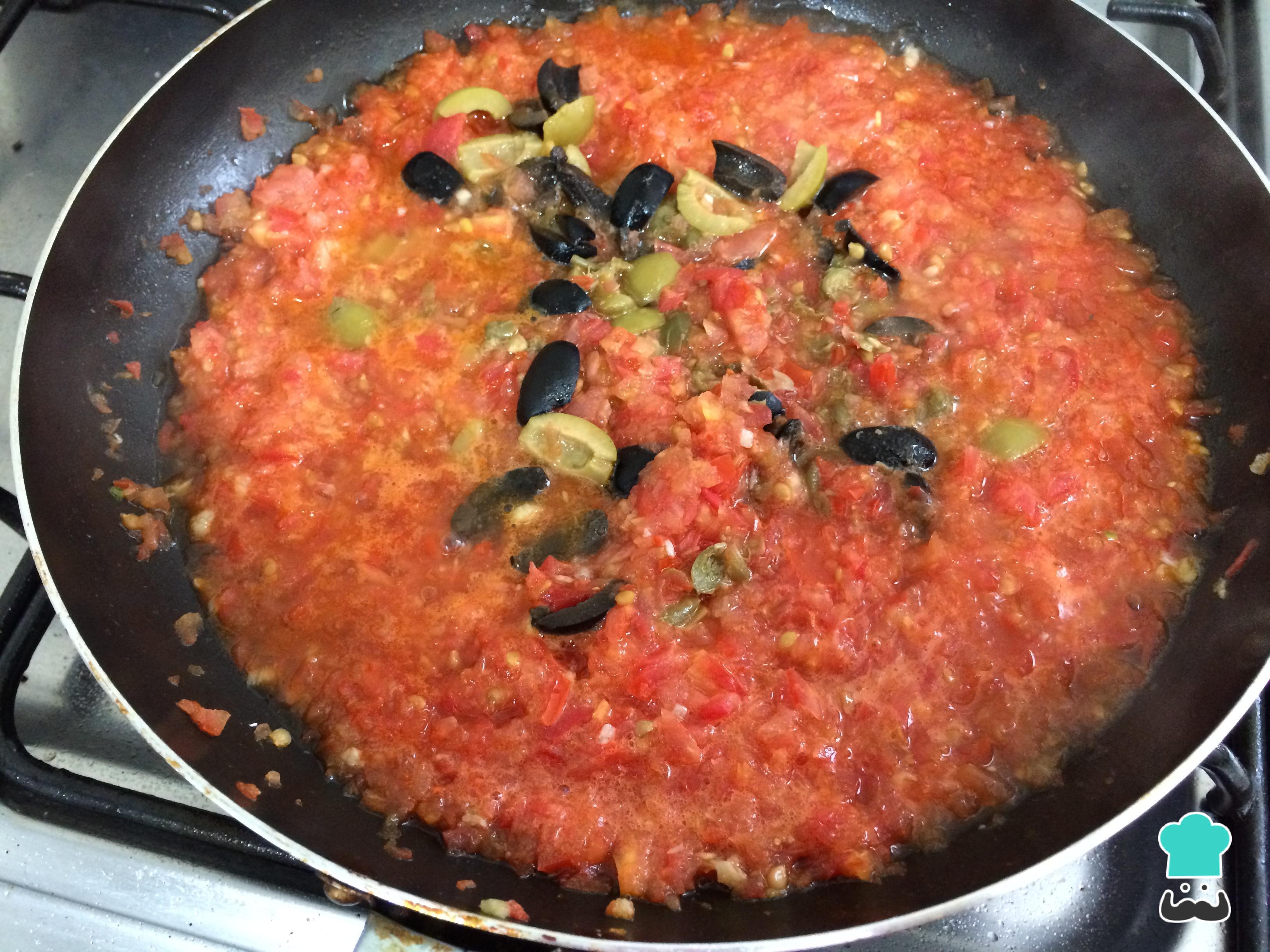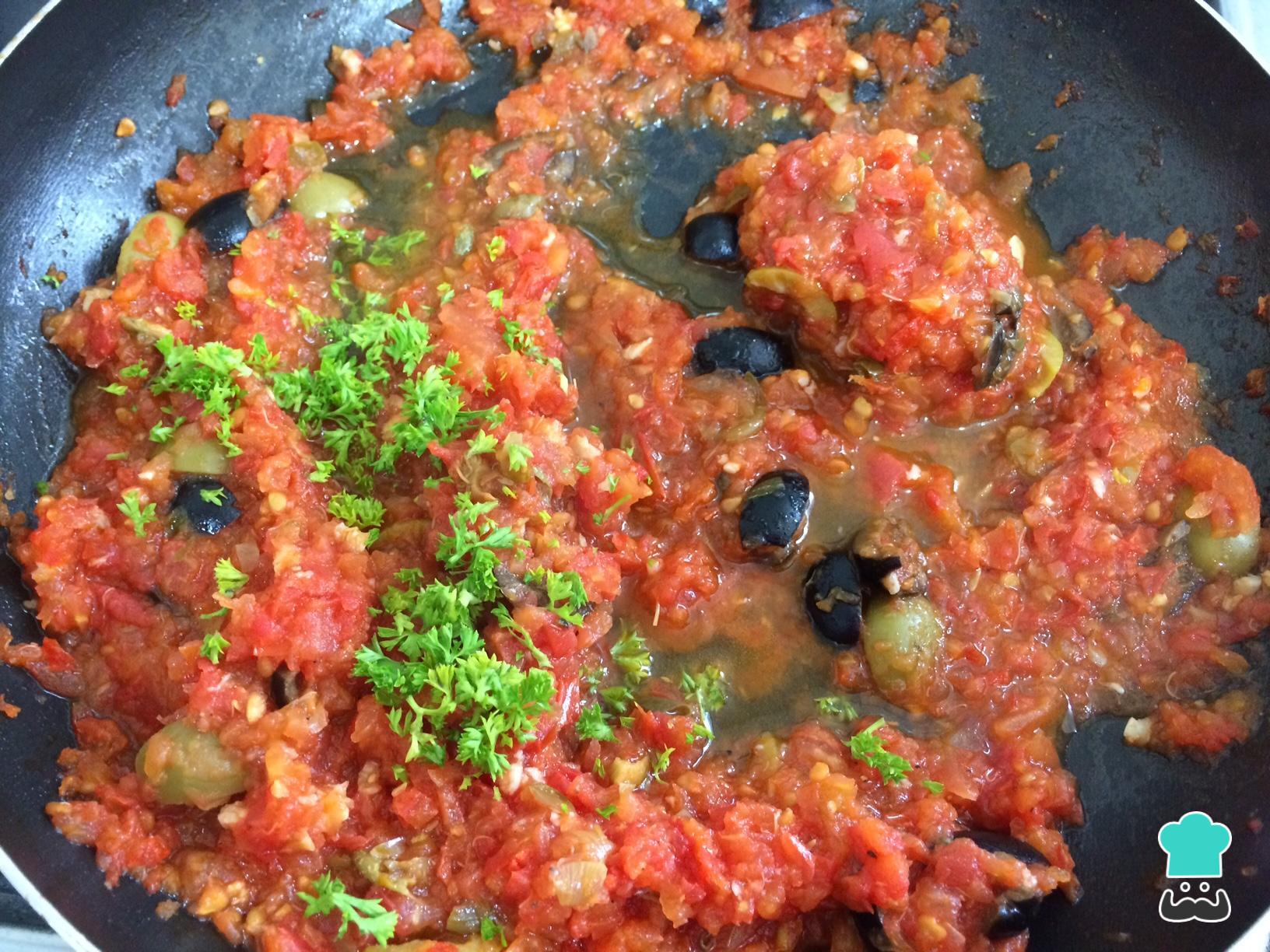 Após o tempo indicado adicione as azeitonas cortadas em metades e sem o caroço, as anchovas cortadas finamente e as alcaparras. Misture e cozinhe por mais 10 minutos, para apurar o sabor.