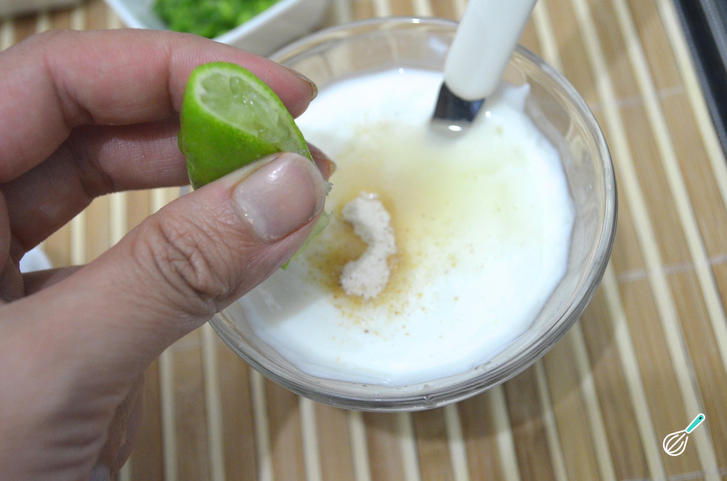 Coloque o iogurte em uma pequena tigela e misture com o suco de meio limão e o alho em pó.