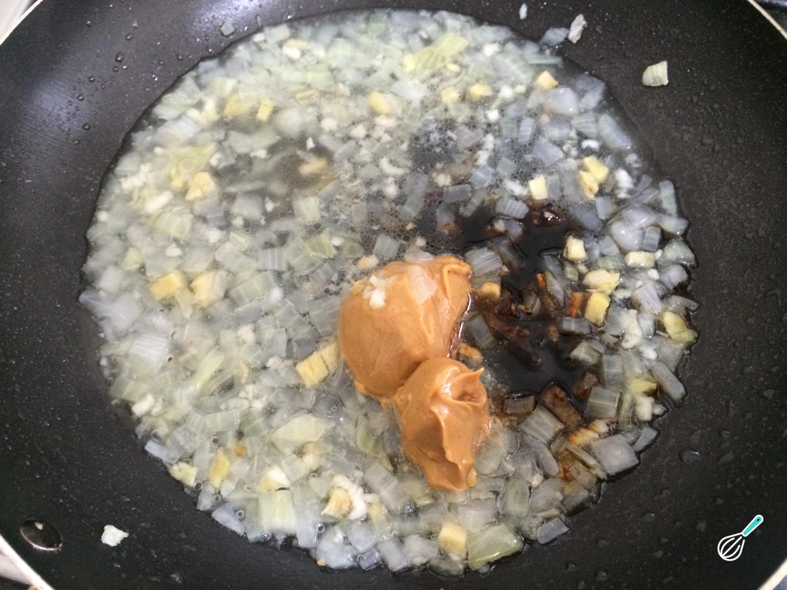 Em uma frigideira com óleo quente, refogue a cebola picada em cubos pequenos até que esteja macia. Em seguida adicione o alho e gengibre, também finamente picados, misture e cozinhe por mais um minuto.