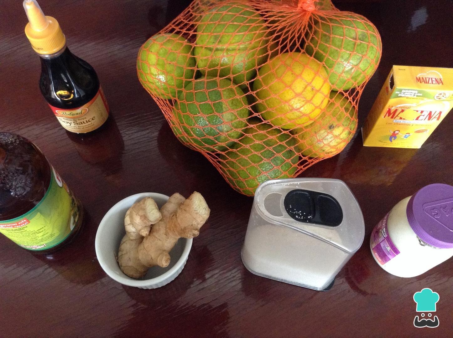 O primeiro passo para fazer a receita de molho teriyaki é reunir os ingredientes. As quantidades indicadas rendem cerca de 350 ml de molho, mas isto irá depender da quantidade de suco que têm as laranjas.
