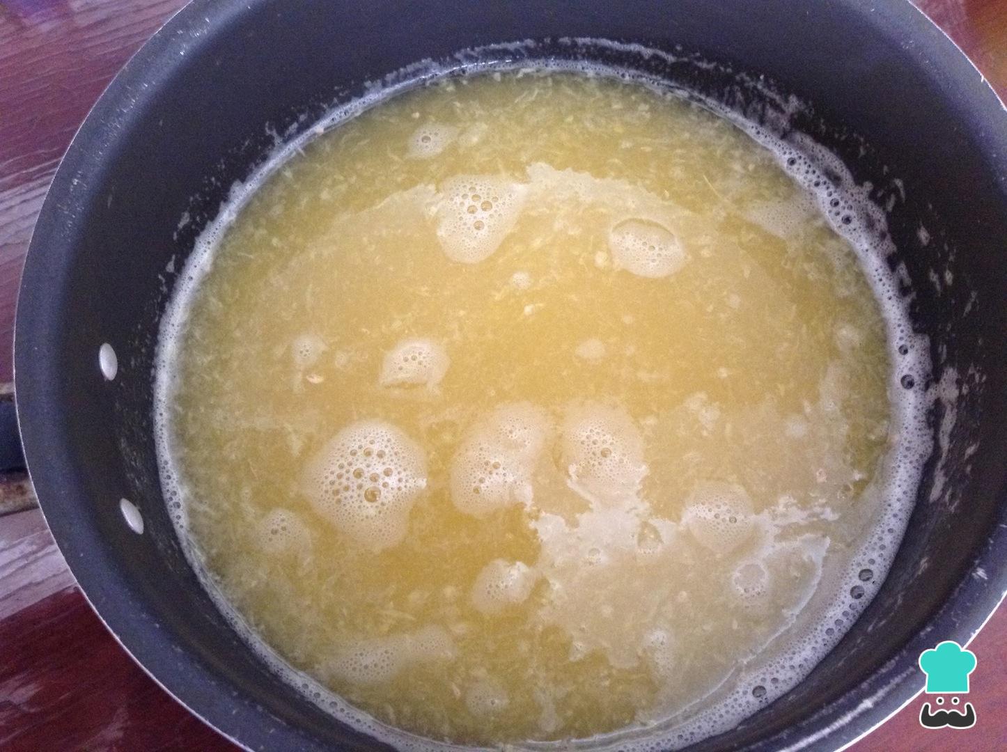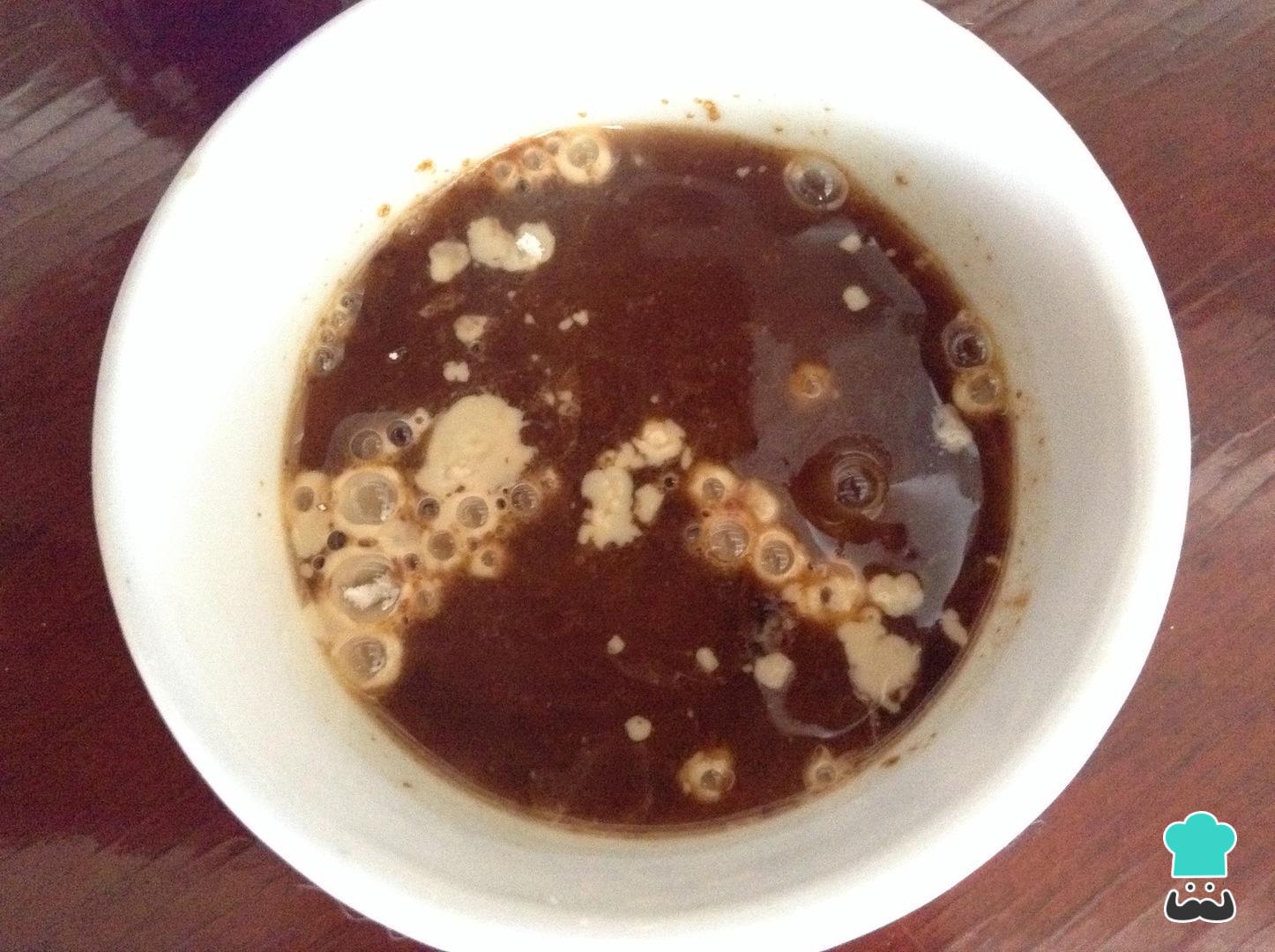 Assim que o molho teriyaki tenha fervido por 20 minutos, retire um pouco e acrescente à maisena. Com a ajuda de uma colher, misture muito bem para dissolver a maisena por completo.