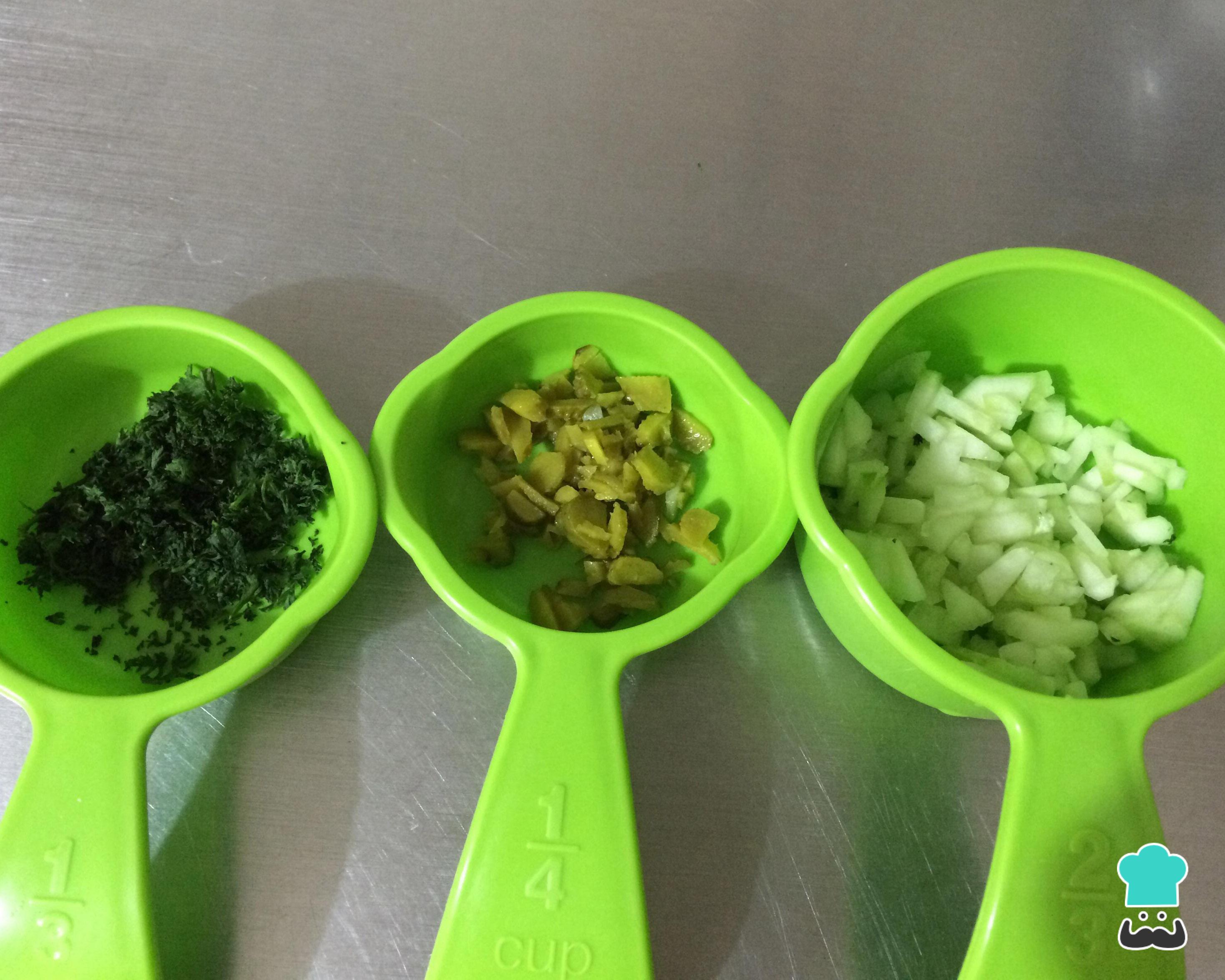 Adicione o pepino, os pepininhos e a salsinha picados, misture e prove para acertar o sabor a gosto.