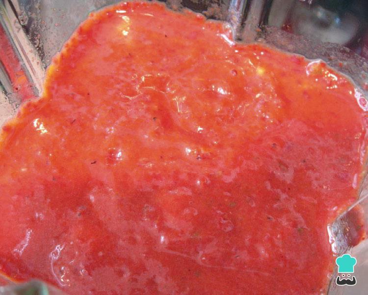 Lave os tomates e retire as sementes. Corte em pedaços e coloque no liquidificador junto com a cebola e os alhos descascados.