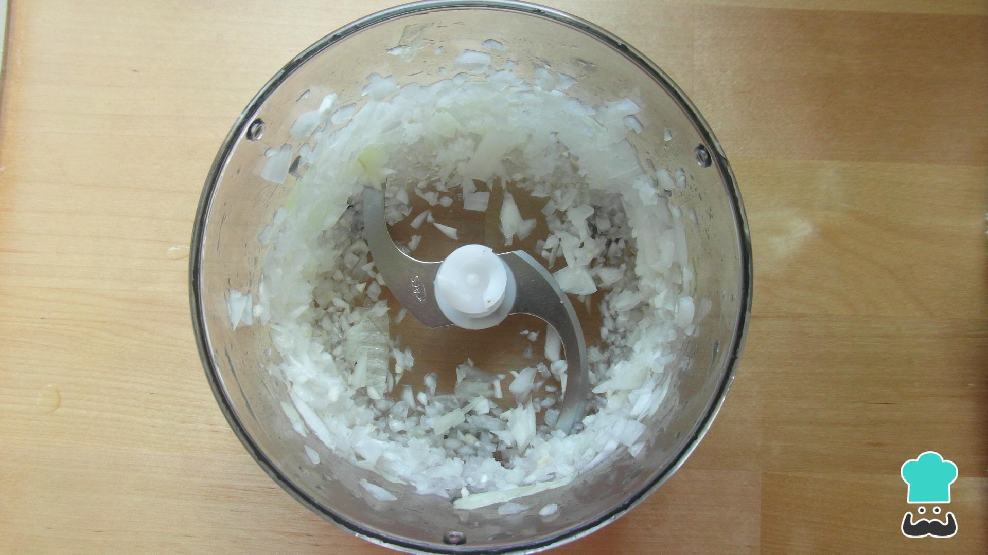 Descasque e pique a cebola finamente, à mão ou num processador.