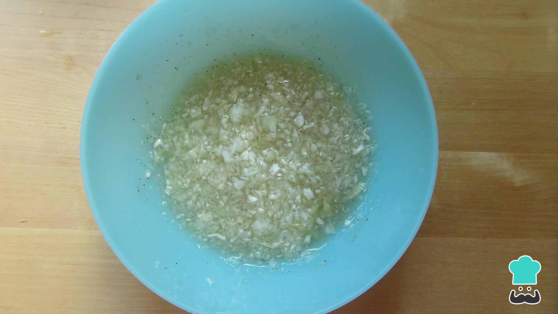 Coloque a cebola numa tigela junto com o suco do limão e temperada de pimenta do reino. Se você não gostar muito do toque ácido do limão, pode usar somente metade dele. Esta é a base do molho vinagrete para salada.