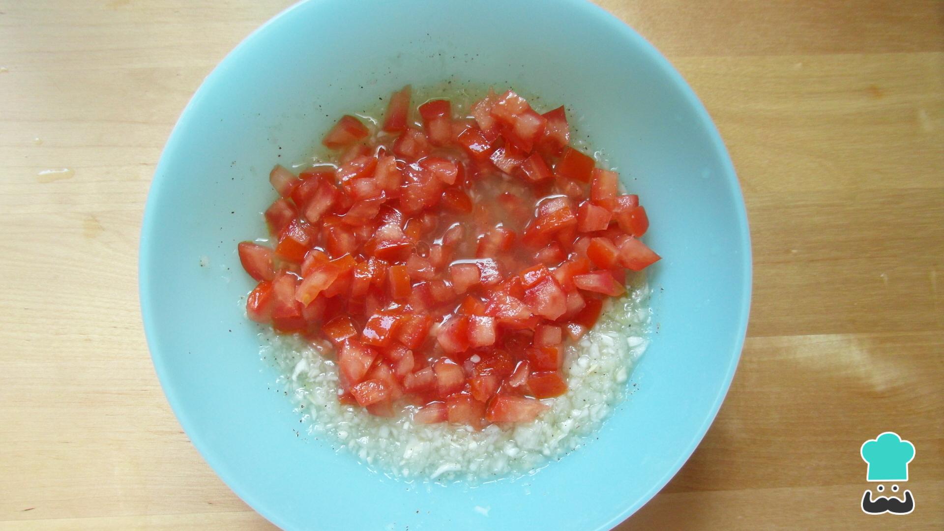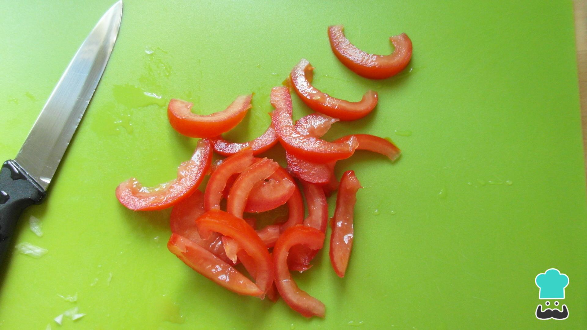 Lave o tomate e retire-lhe as sementes. Corte em tiras finas e, depois, em cubinhos pequenos.