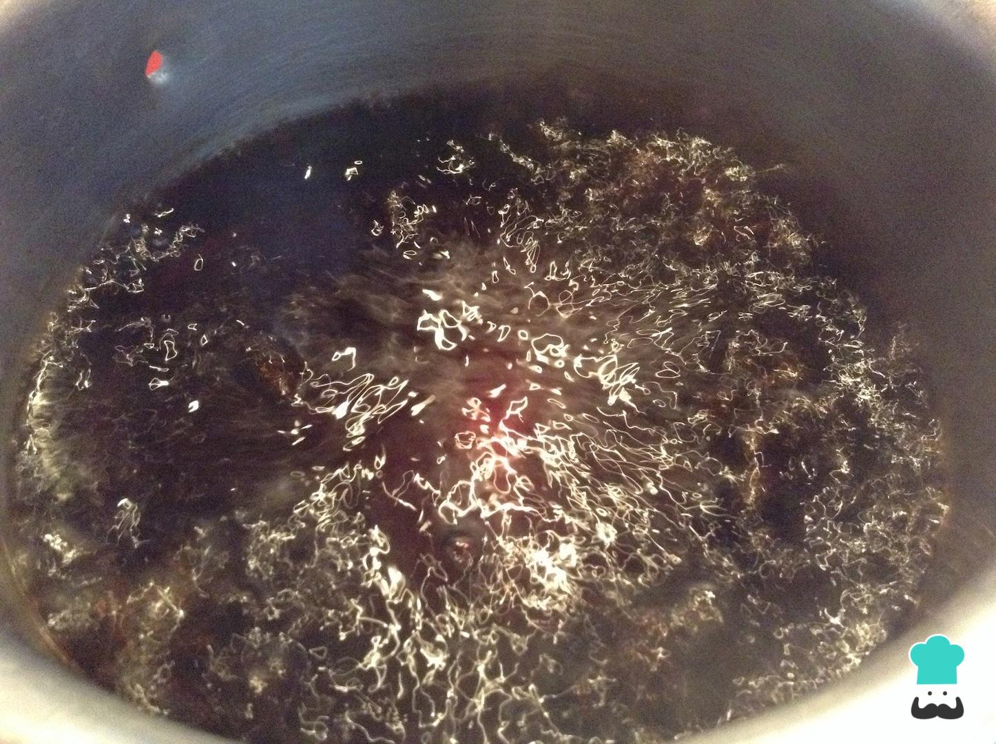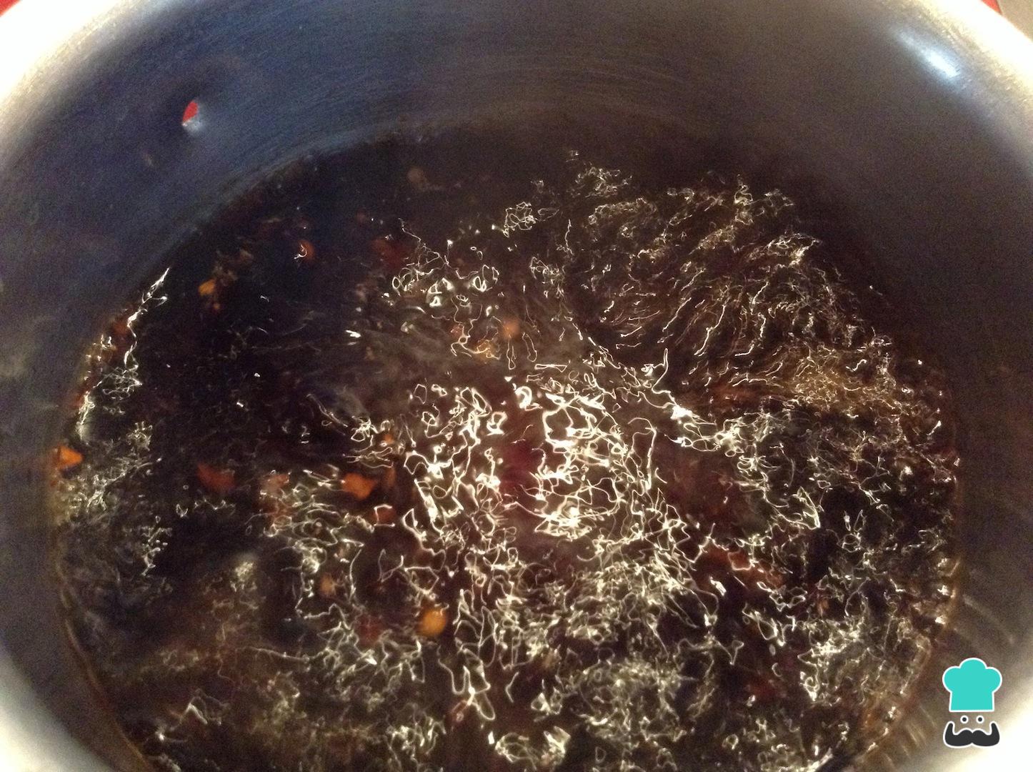 Quando a preparação anterior estiver fervendo, baixe o fogo e deixe espessar.