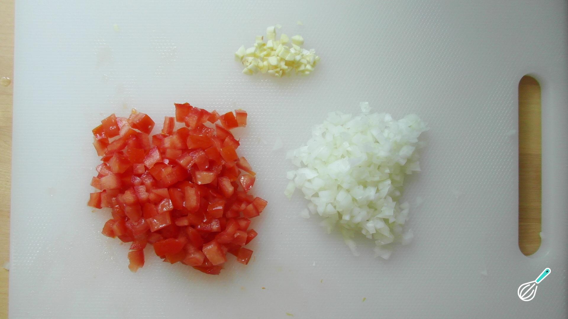 O passo seguinte da moqueca capixaba de peixe é picar os tomates (sem sementes) em cubos pequenos, a cebola também em cubos e o alho em pedaços bem finos.