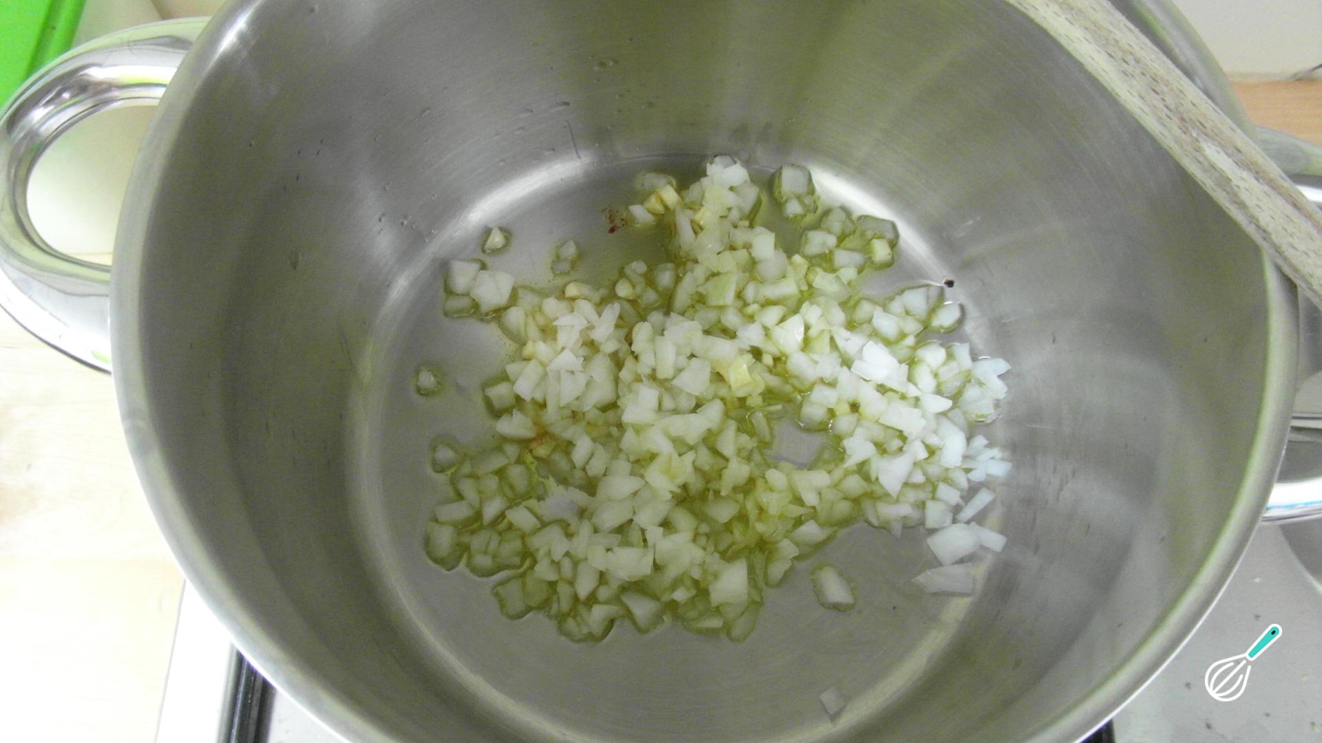 Numa panela em fogo médio com o azeite, refogue a cebola e o alho até dourarem.