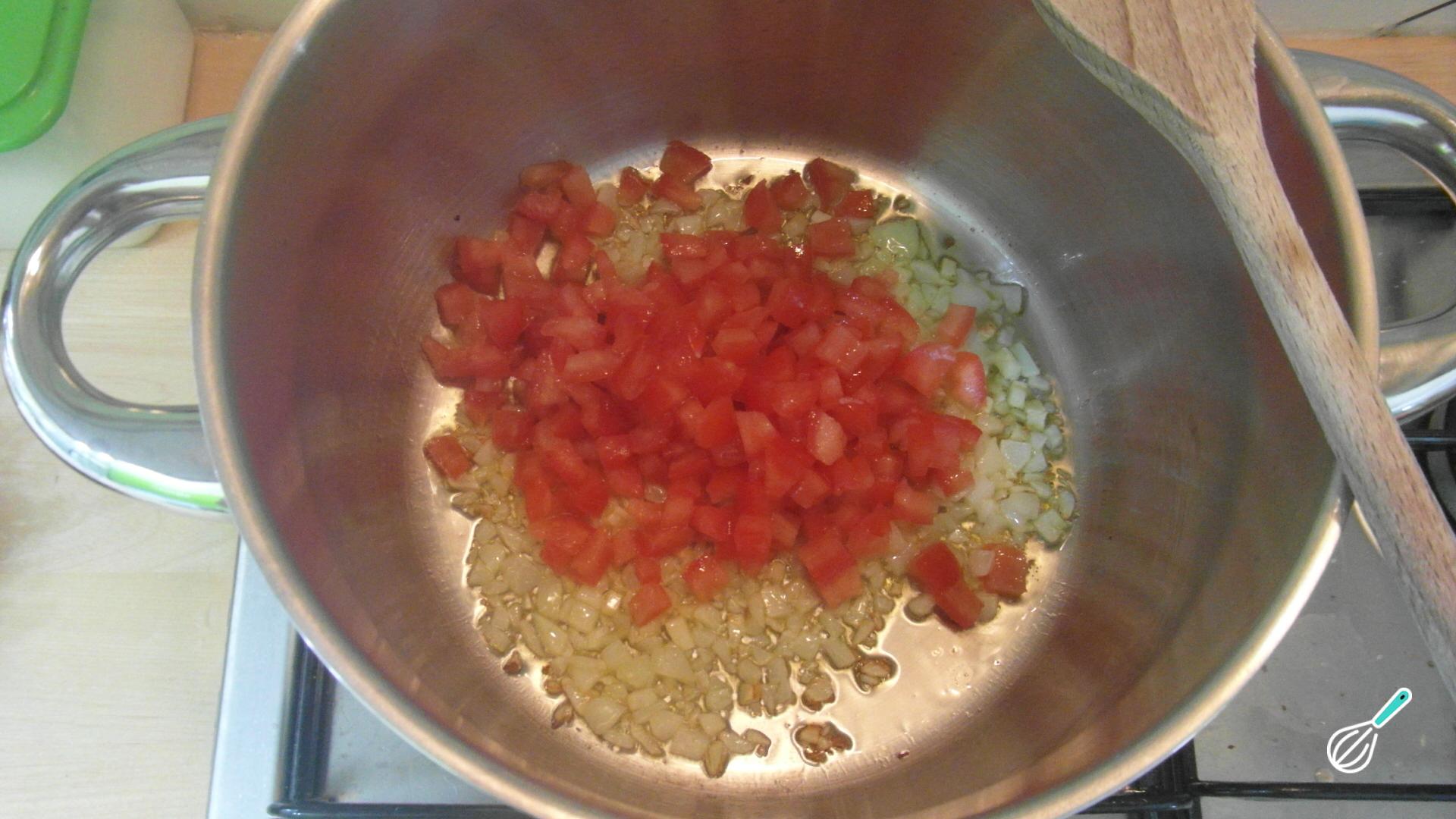 Acrescente o tomate, tampe, baixe o fogo e deixe cozinhar este refogado de moqueca capixaba de peixe por 1-2 minutos.