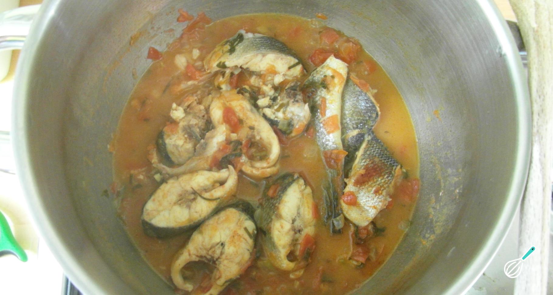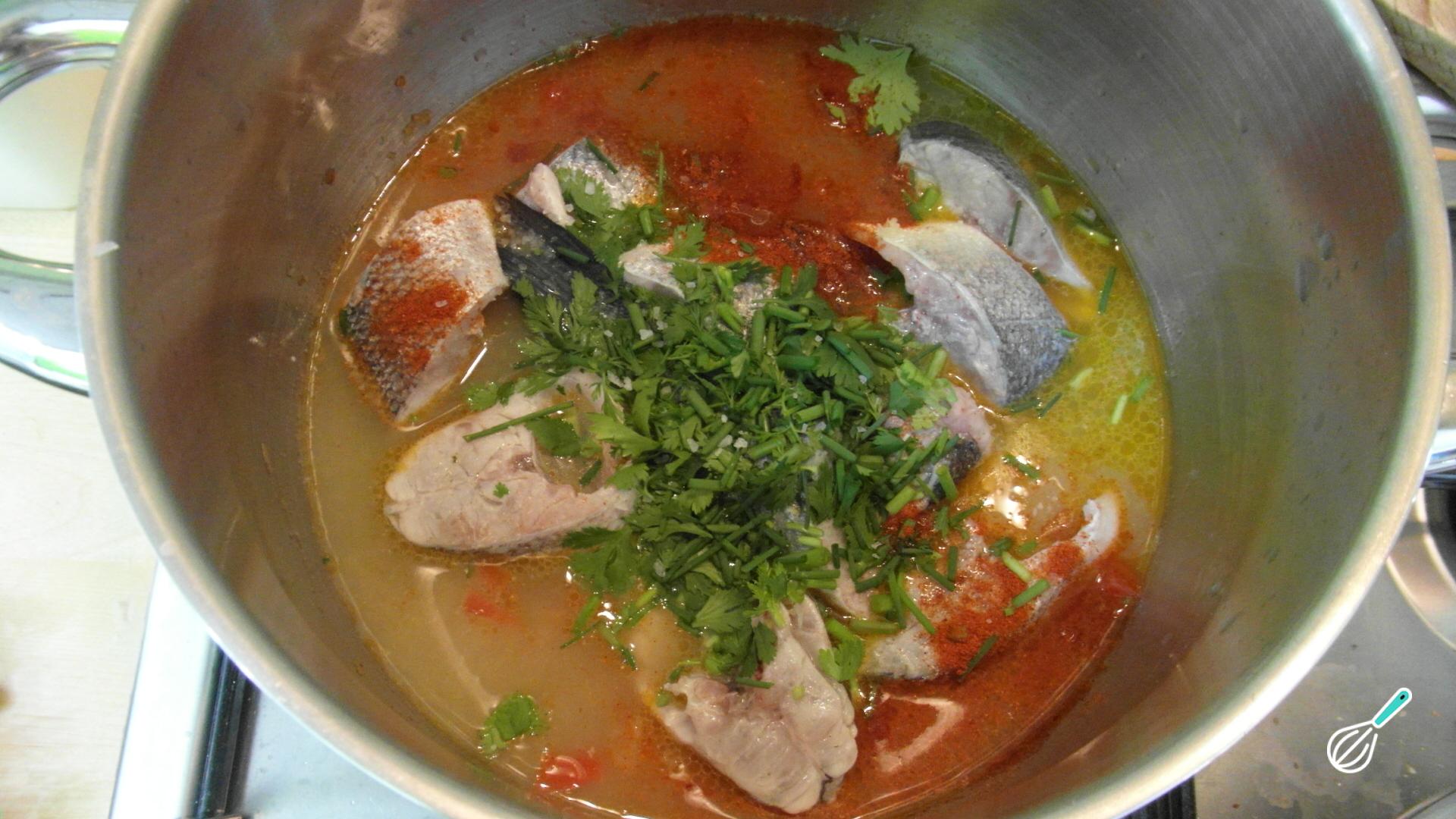 Após o passo anterior, acrescente o peixe sem a marinada, o caldo, o urucum ou páprica e as ervas aromáticas picadas. Tempere com sal, tampe e cozinhe em fogo médio por 30 minutos, mexendo 1 ou 2 vezes.