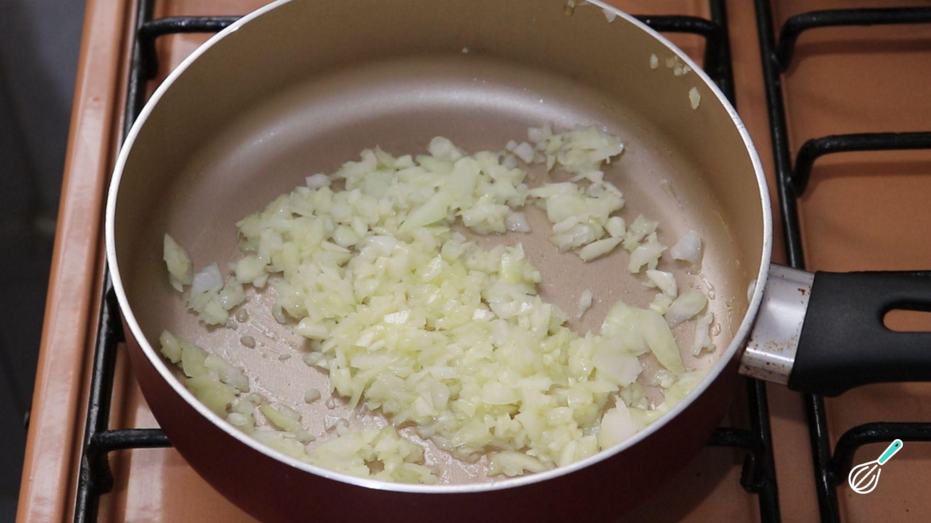 Leve uma panela ao fogo médio e refogue a cebola e o alho no azeite.