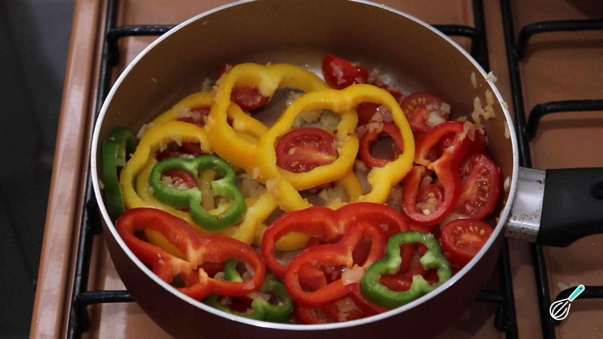 Junte os pimentões e os tomates e misture bem. Tempere com sal e pimenta a gosto.