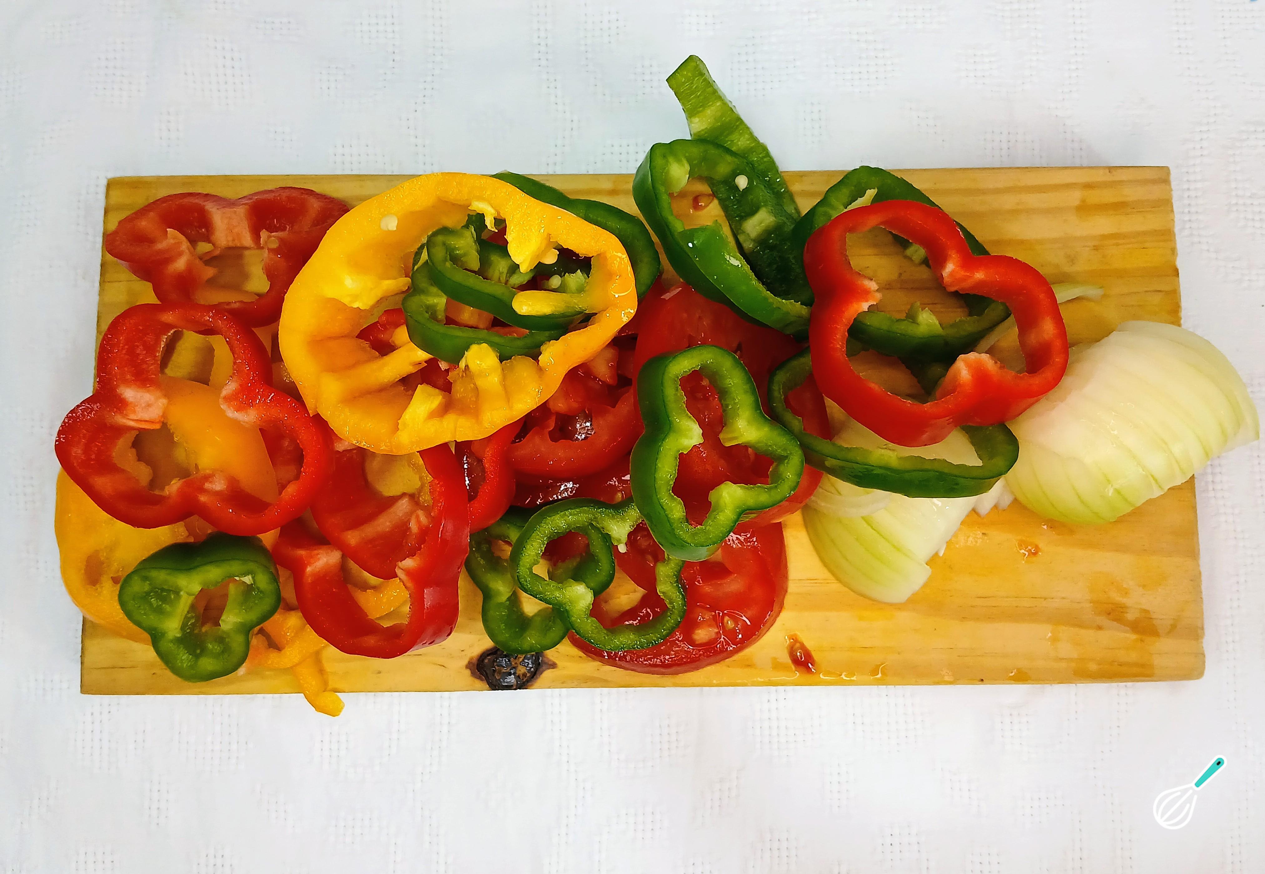 Ingredientes devidamente separados, corte os tomates e os pimentões em rodelas. Tire a cabeça dos pimentões e linpe bem a parte de dentro, retirando toda a parte branca. Retire a cabeça dos tomates e corte também em rodelas retirando as sementes. A cebola corte em formato meia-lua. Reserve.