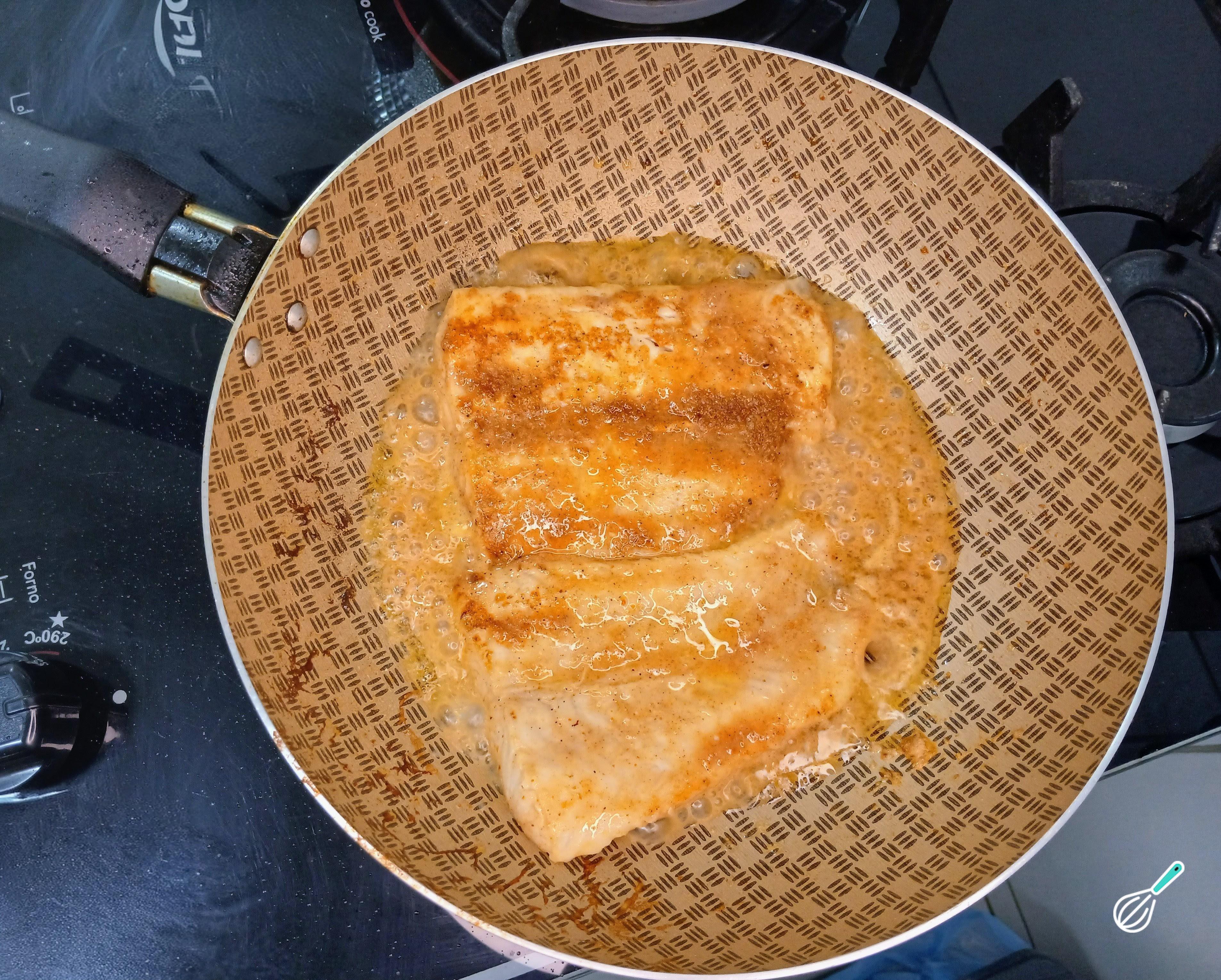 Depois de dourar os camarões, retire-os e reserve em um prato. Coloque o restante do azeite de dendê e acrescente as postas de peixe e deixe que doure também dos dois lados.