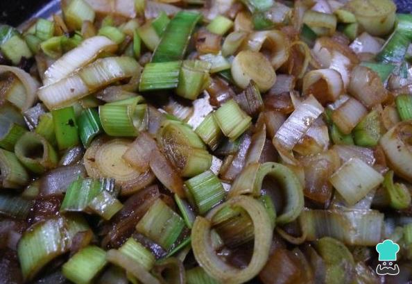 Comece por colocar em uma panela (de preferência de barro), os azeites, a cebola picada e o alho-poró, cortado às rodelas.