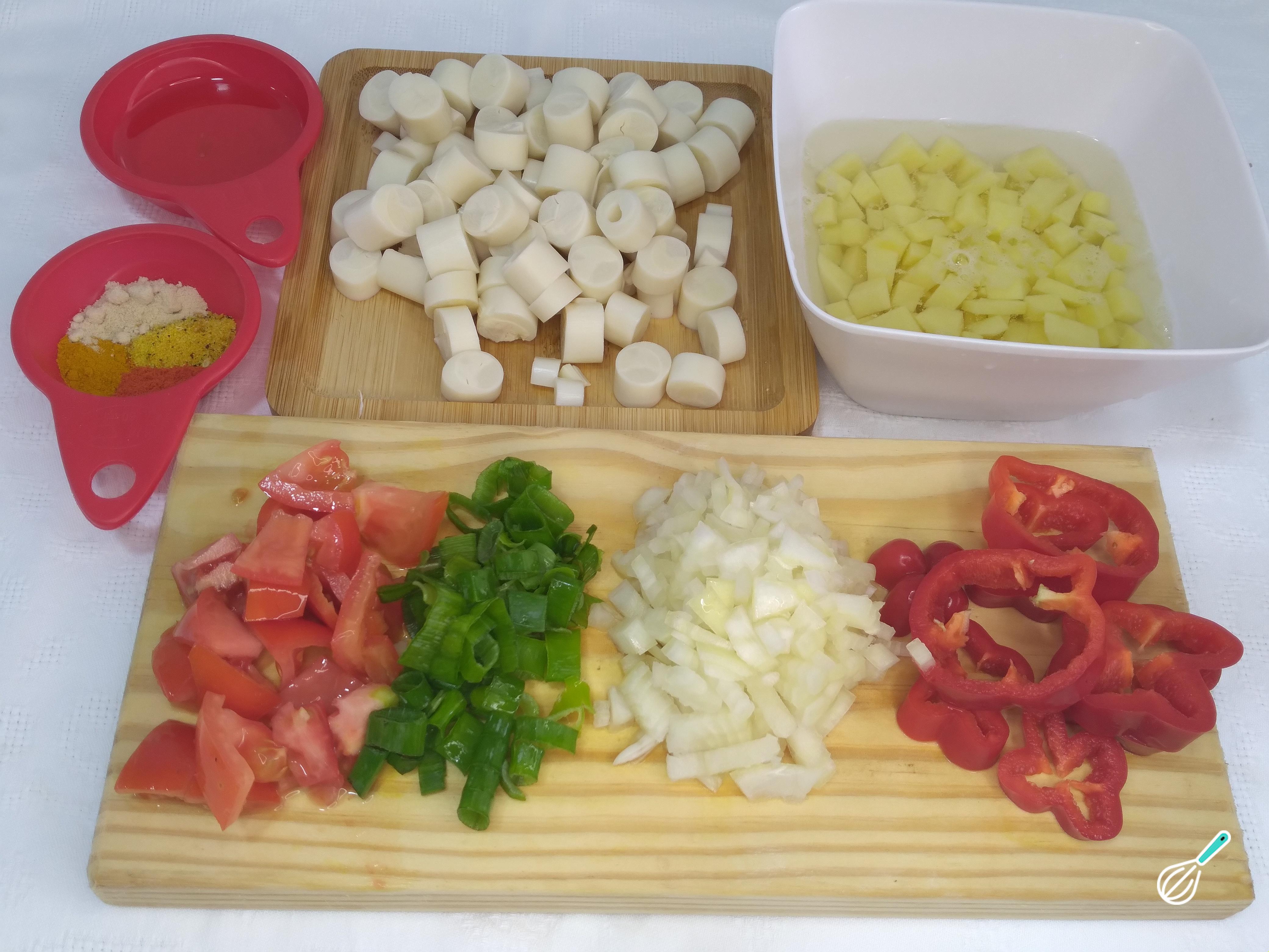 Comece drenando o palmito. Retire toda a água e corte o palmito em rodelas com espessurade um dedo, aproximadamente. Assim o palmito ficará aparente no prato. A batata, corte em quadrados pequenos. A cebola, corte em quadrados pequenos também. Esses cortes, ajudam na estética do prato. Separe os temperos e o leite de coco. Corte o pimentão em rodelas.