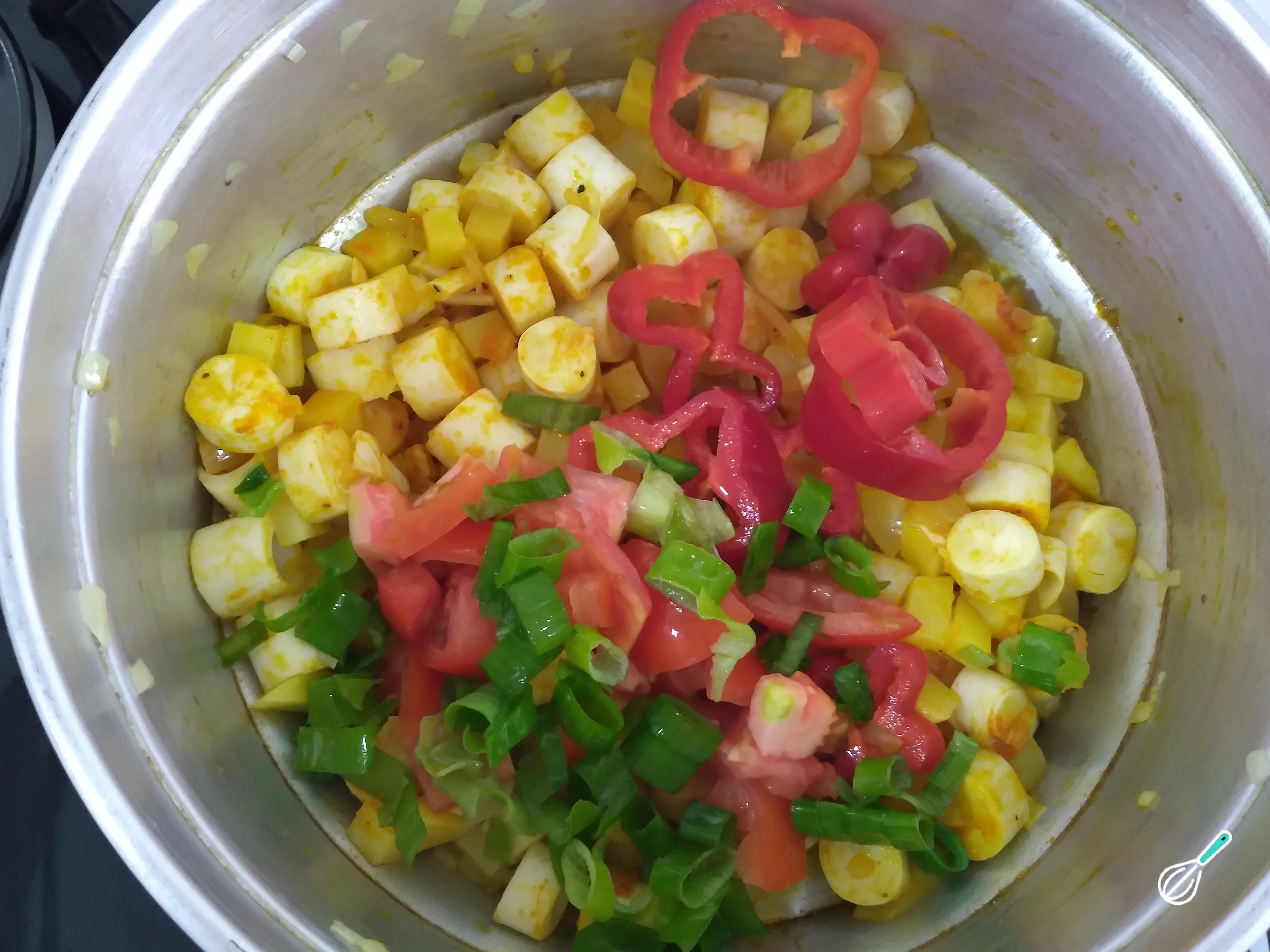 Depois de refogar a batata e o palmito, coloque os temperos, acrescente os tomates, o pimentão e a cebolinha verde picada. Mexa para incorporar os sabores aos ingredientes. Deixe refogar um pouco.