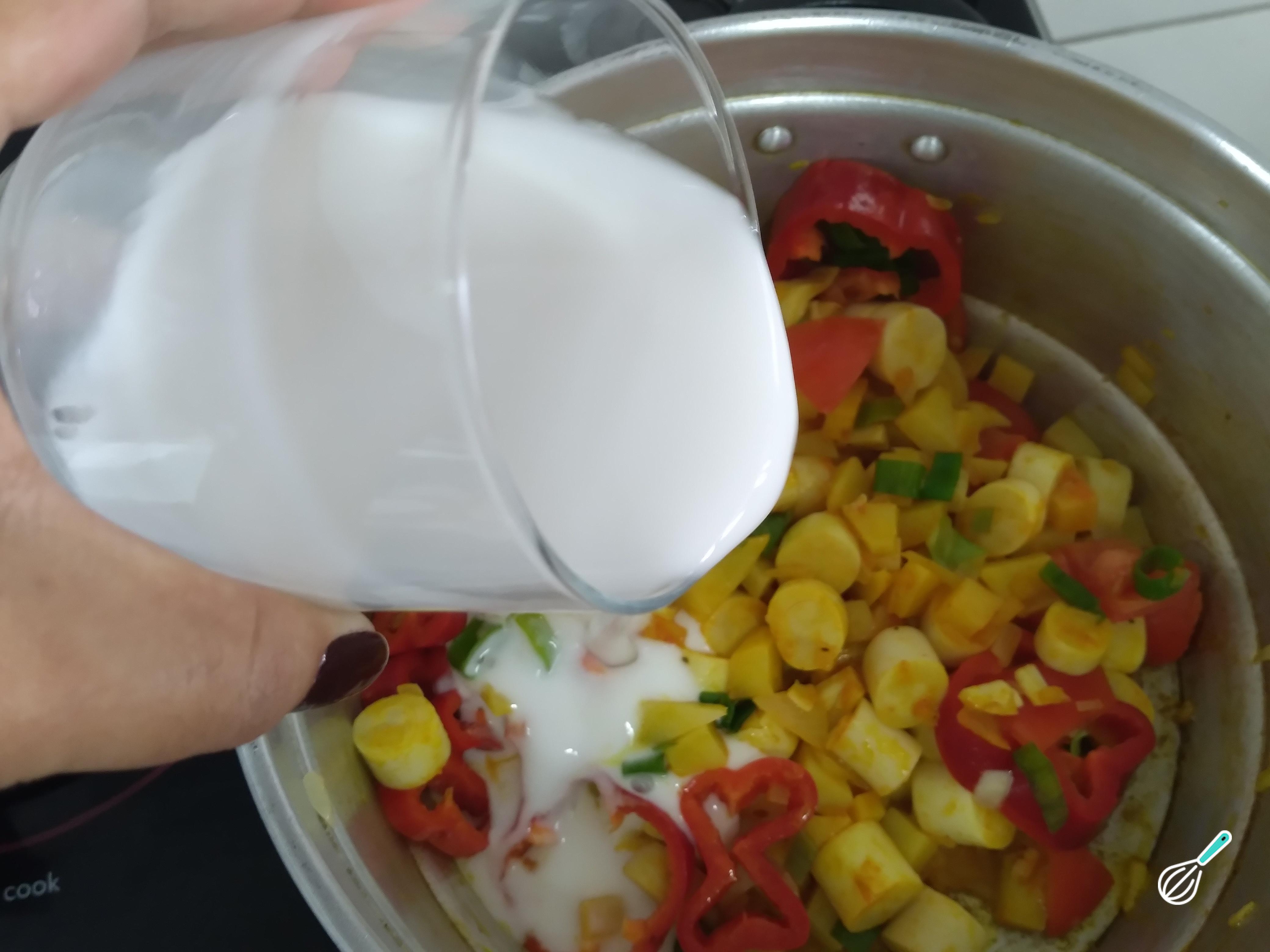 Em seguida, acrescente o leite de coco. O ideal é que o leite de coco cubra os ingredientes para que cozinhem bem. Se não for o suficiente poderá acrescentar um pouco de água para cobrir tudo.