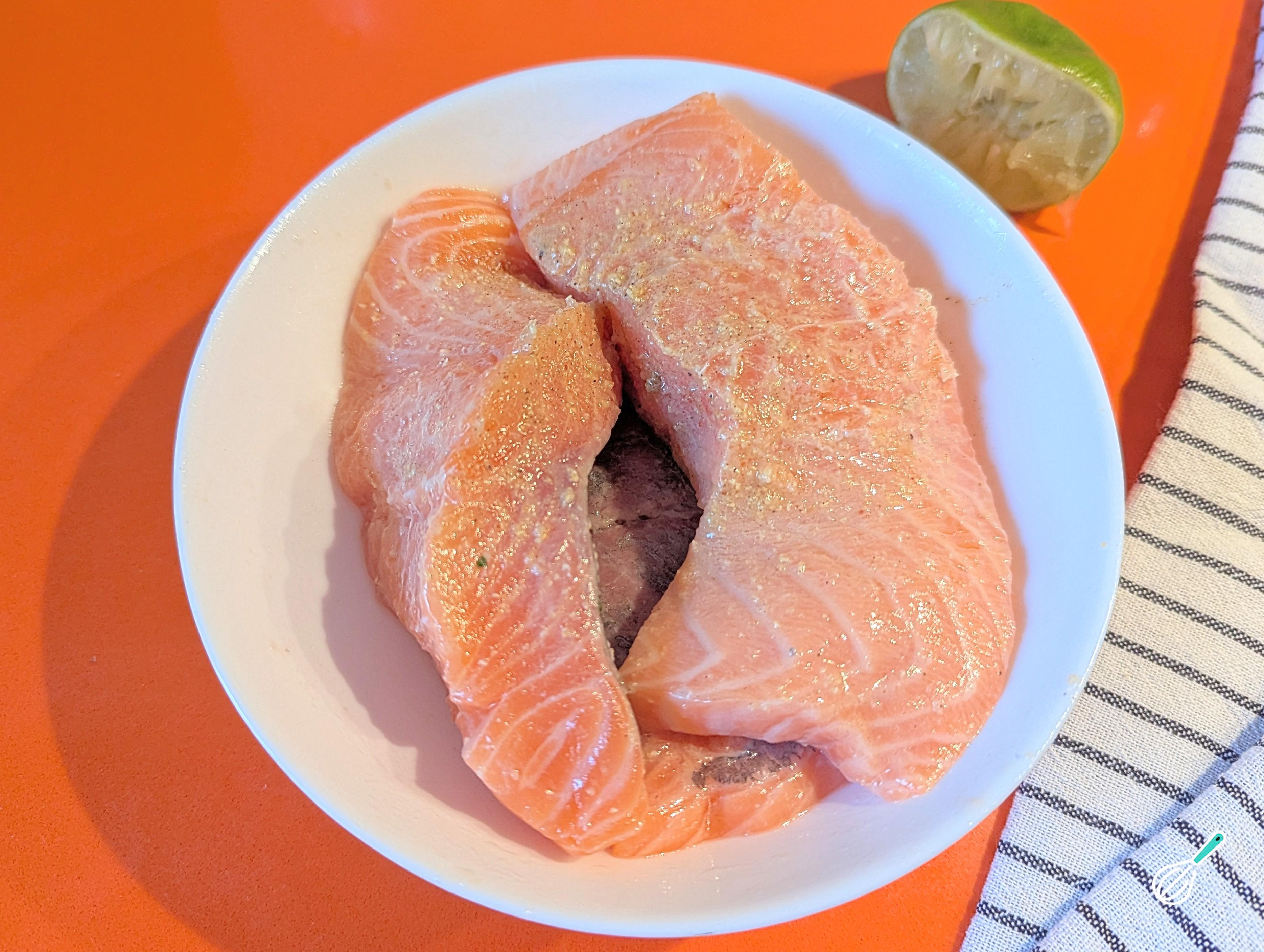 Tempere o salmão com suco de meio limão, sal, alho em pó e pimenta branca em pó. Deixe marinar por cerca de 20 minutos.
