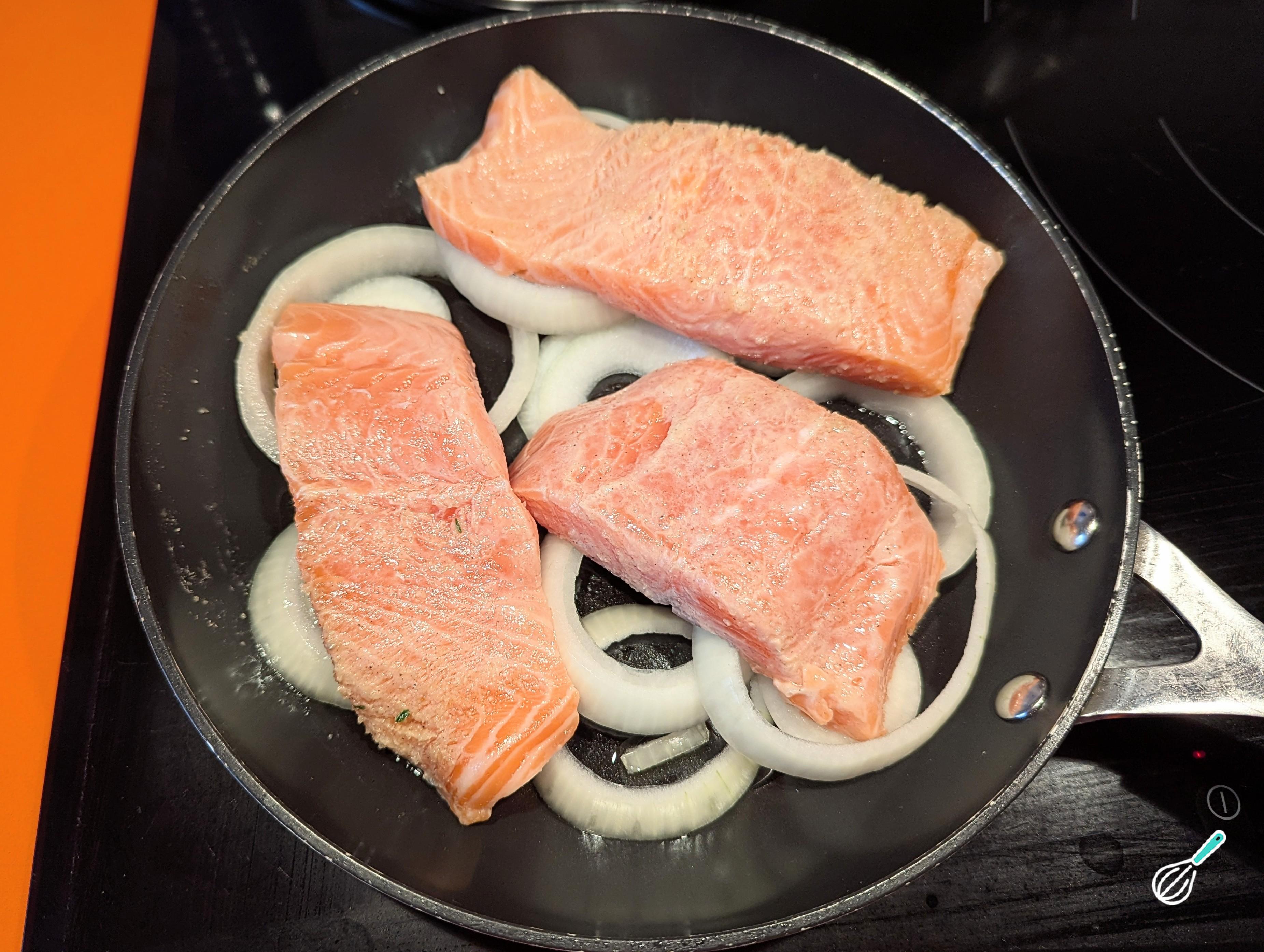 Em uma frigideira média com o fogo baixo, adicione o azeite e forre o fundo com as rodelas de cebola e sobre elas, distribua os pedaços de salmão já temperados.