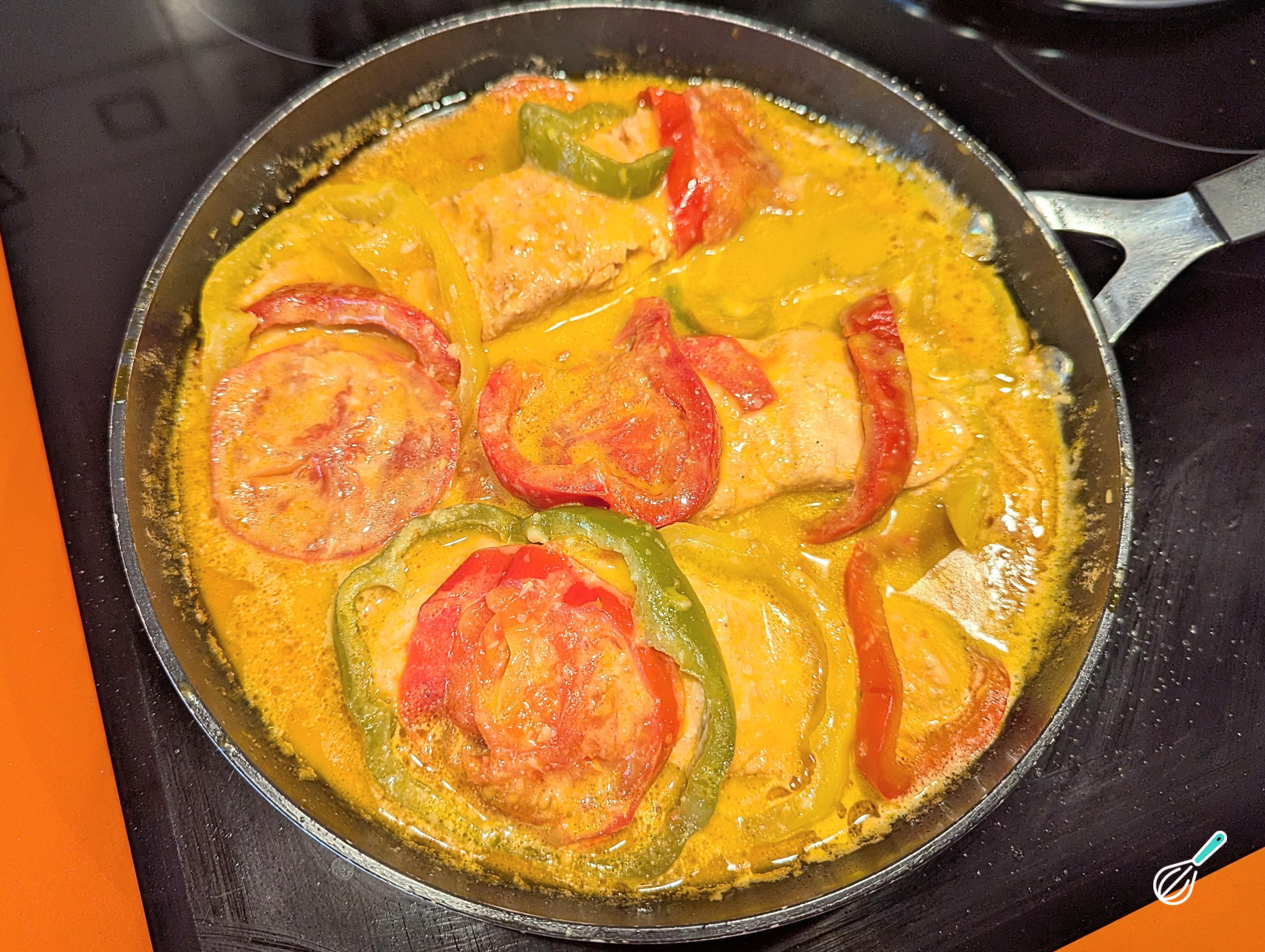 Despeje por cima do peixe o azeite de dendê e junte o leite de coco. Não mexa com a colher, apenas agite a frigideira delicadamente para misturar os sabores.