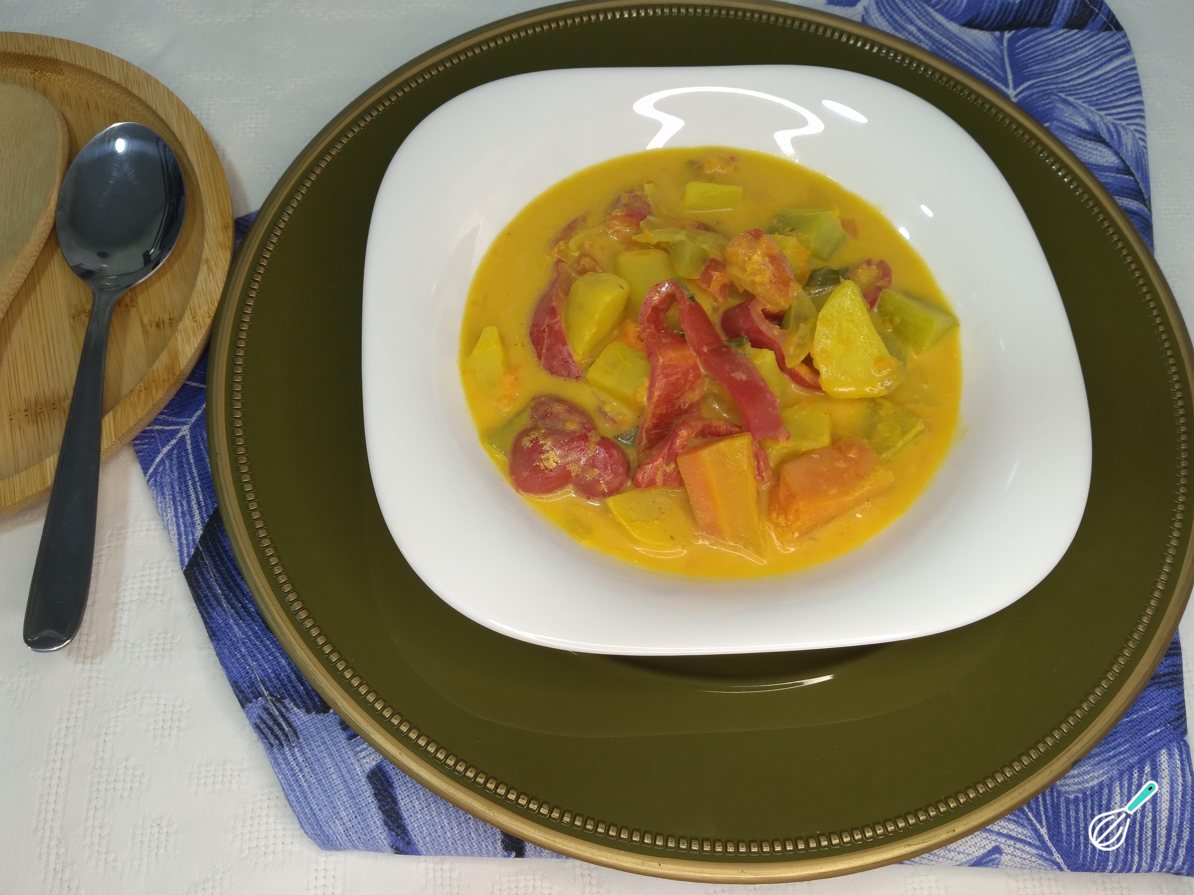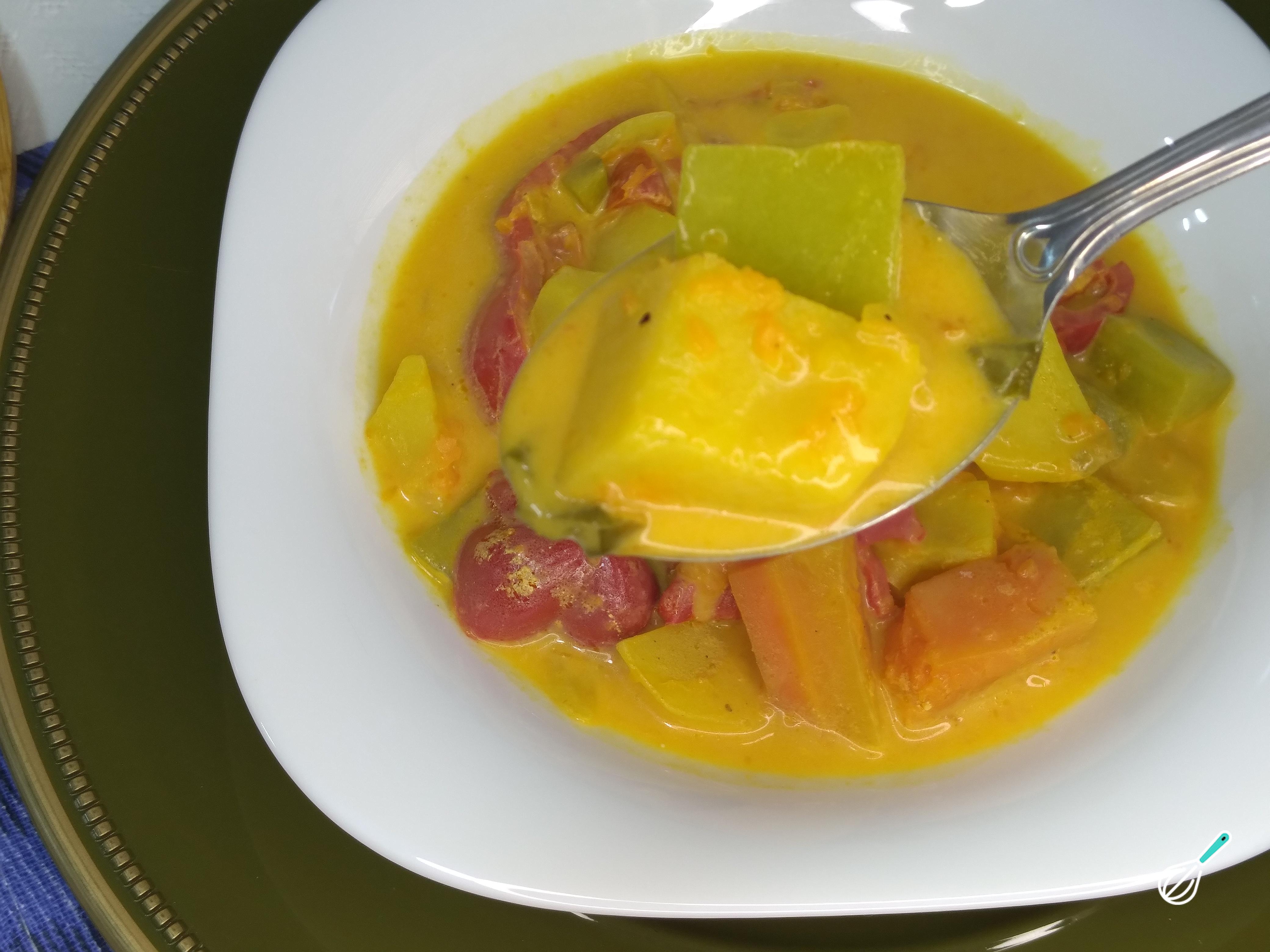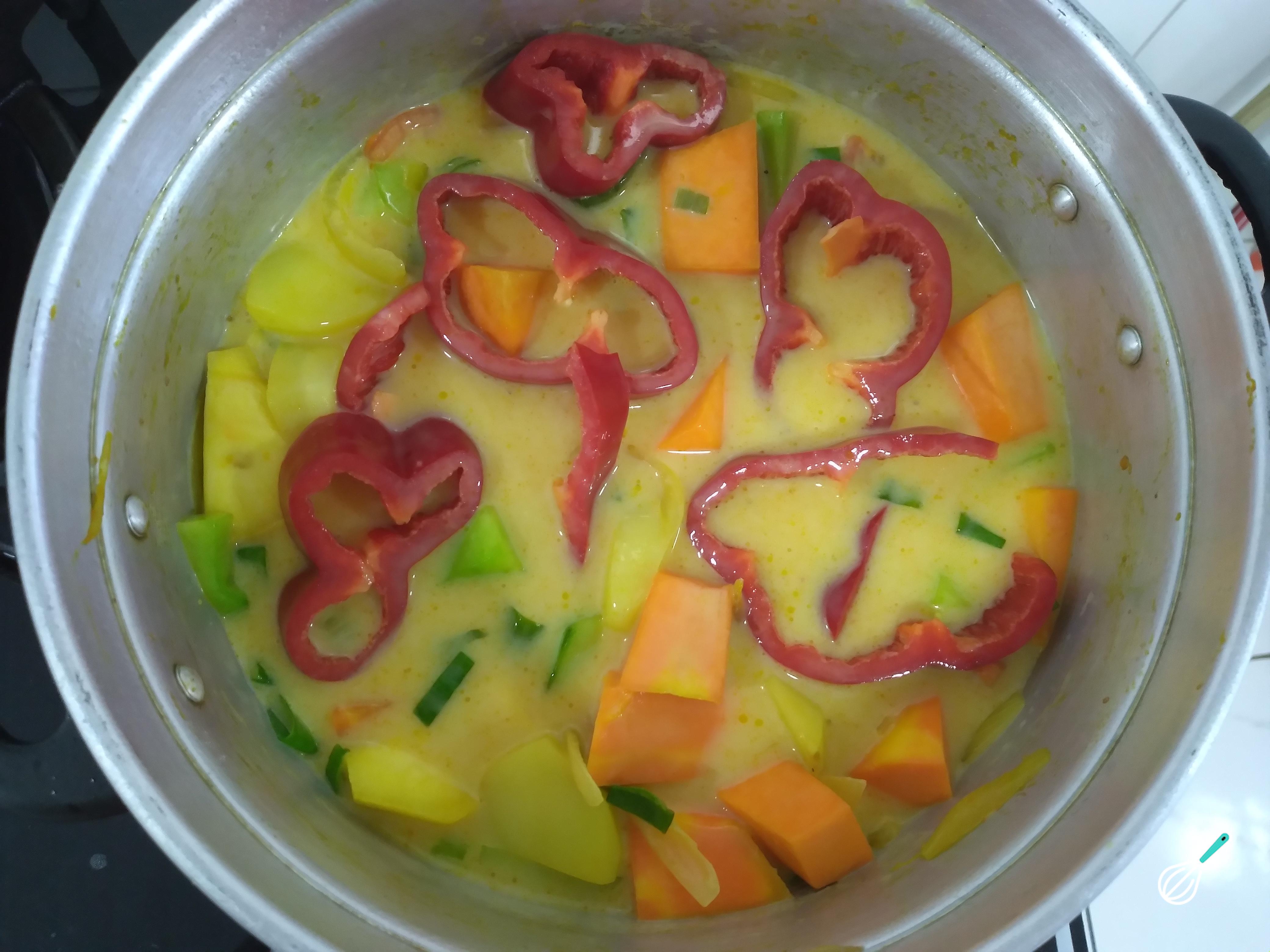 Depois de refogar um pouco, acrescente o leite de coco. É importante que o leite de coco cubra os vegetais, para um cozimento perfeito.