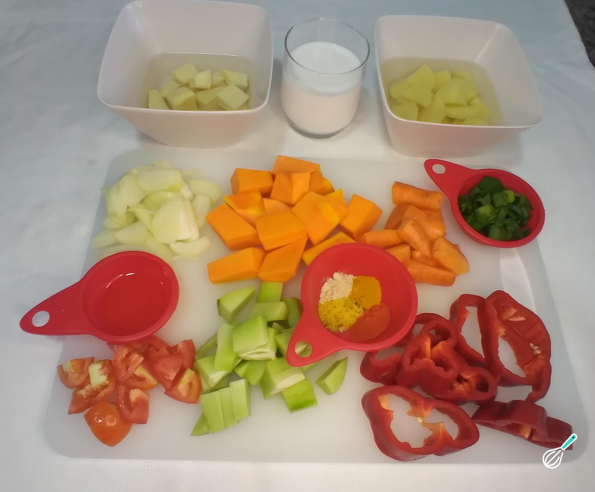 Comece cortando os legumes. A abóbora, a batata inglesa e a batata doce, corte em pedaços maiores e mais largos. O chuchu corte na vertical e faça quadrados finos. A cenoura, corte na vertical.