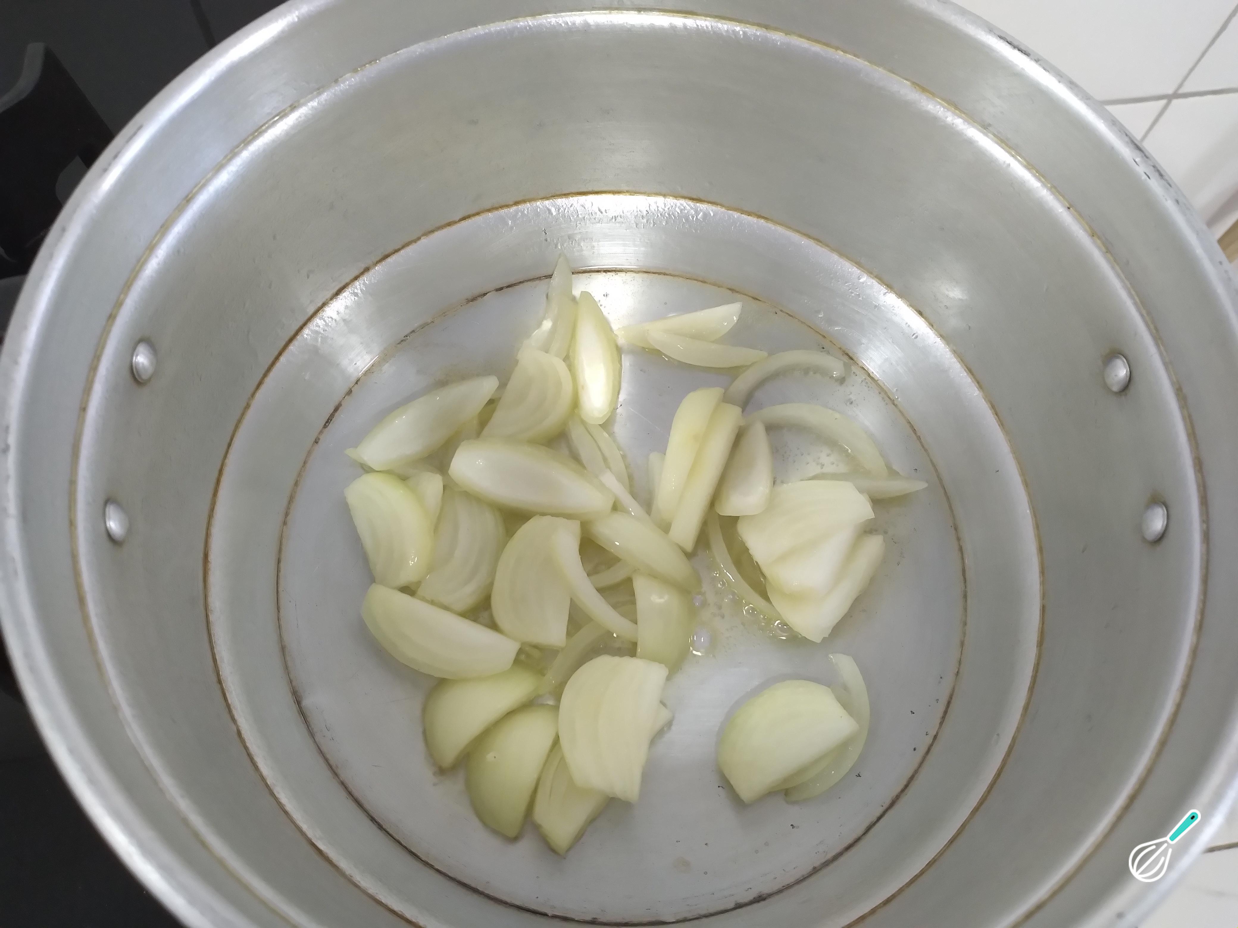 Acrescente um pouco de sal, para a cebola refogar mais rápido e soltar líquido. Mantenha o fogo baixo.