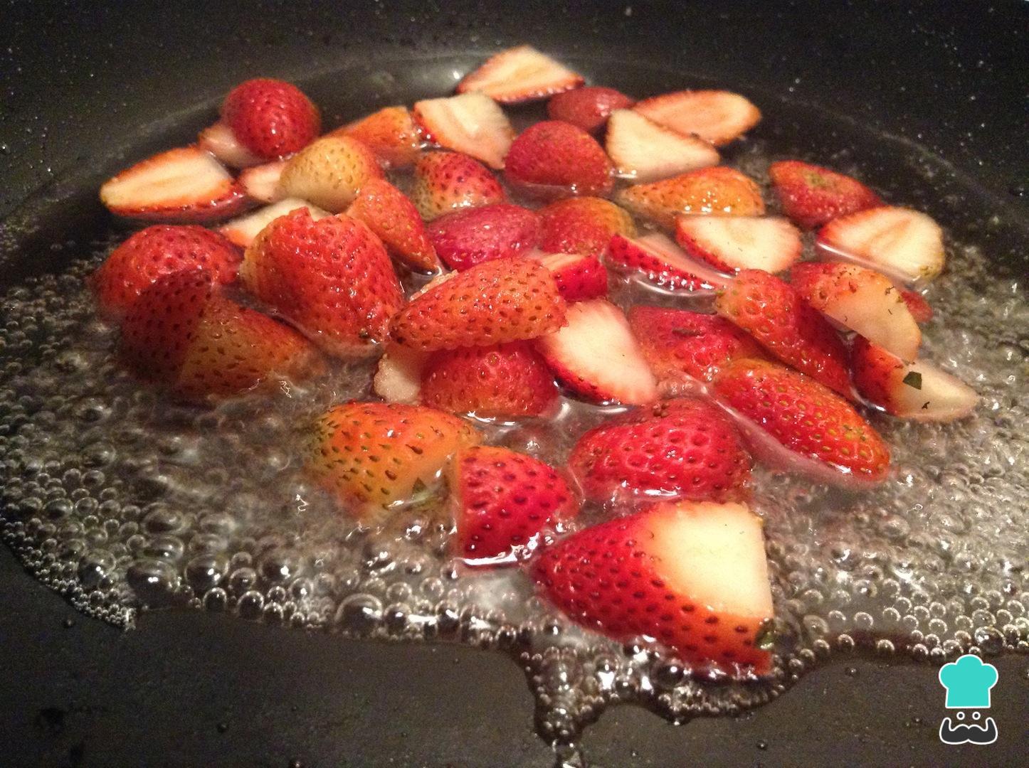 Quando a calda anterior estiver espessa, adicione os morangos lavados e cortados em lâminas, e envolva.