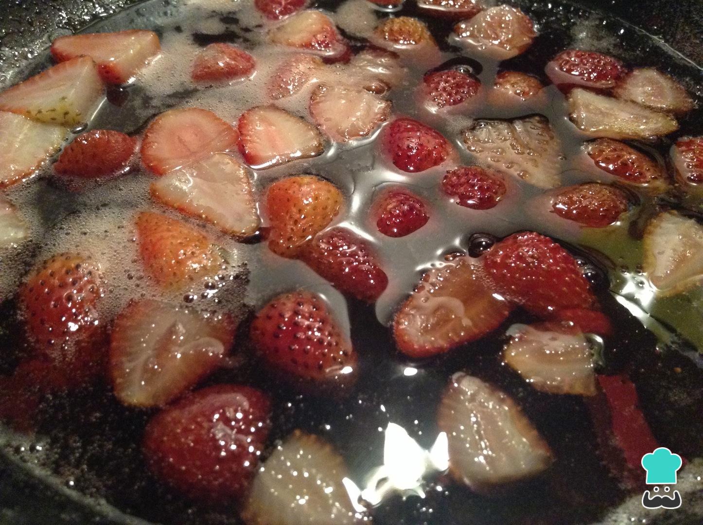 Depois acrescente o vinagre balsâmico e deixe cozinhar em fogo baixo, até que a calda volte a espessar. Quando isso acontecer, desligue o fogo e deixe a preparação esfriar por completo.