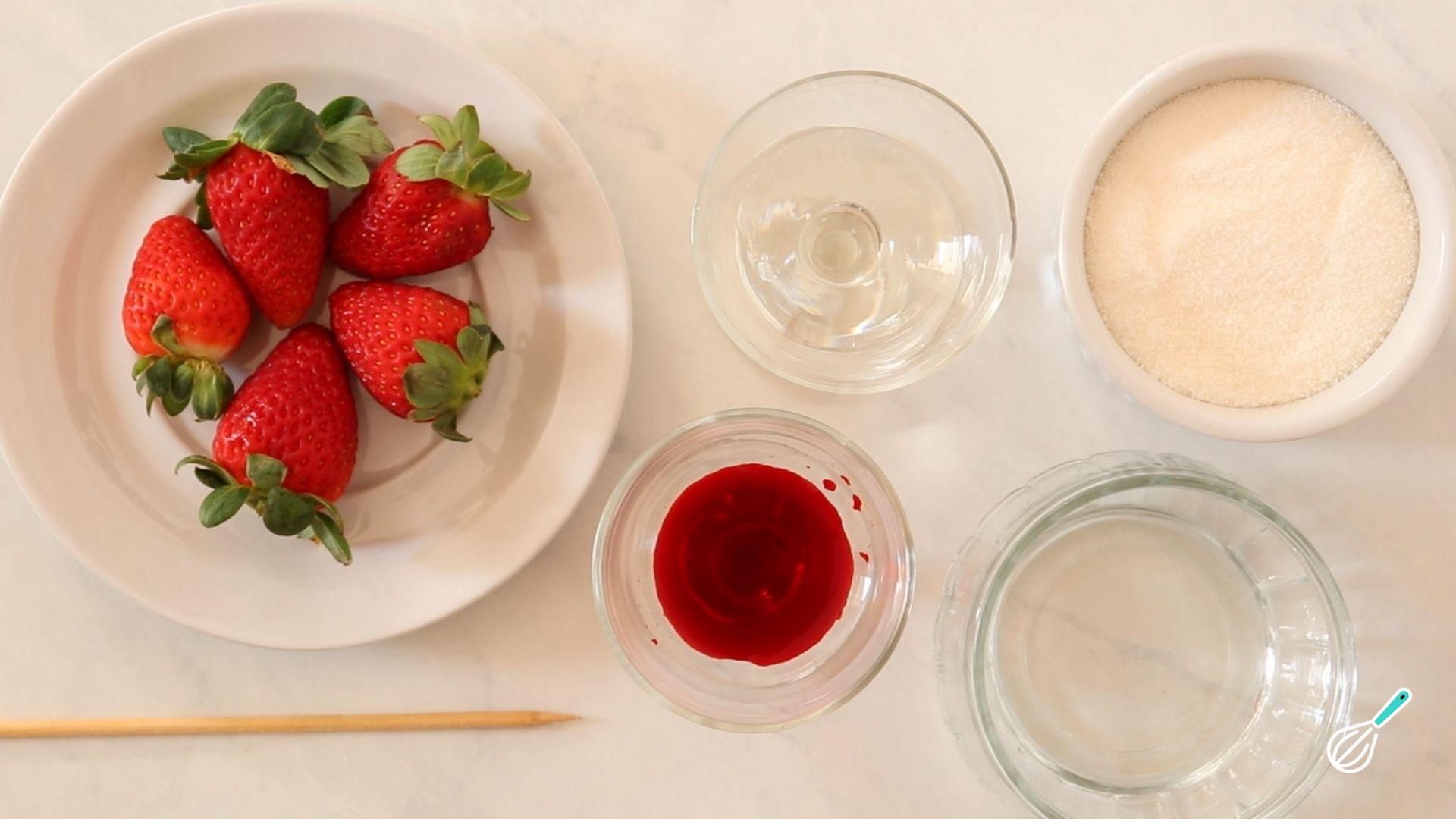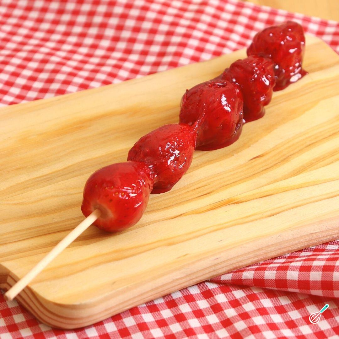 Assim como a clássica maçã do amor, essa versão com morango traz a calda de açúcar cheia de brilho que traz textura crocante e deixa a fruta ainda mais saborosa.