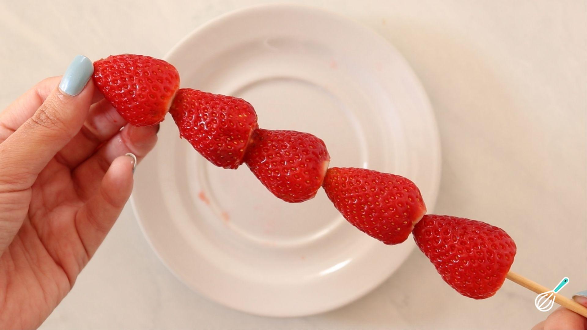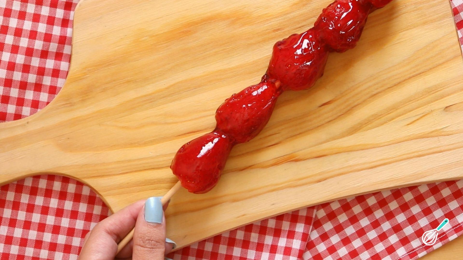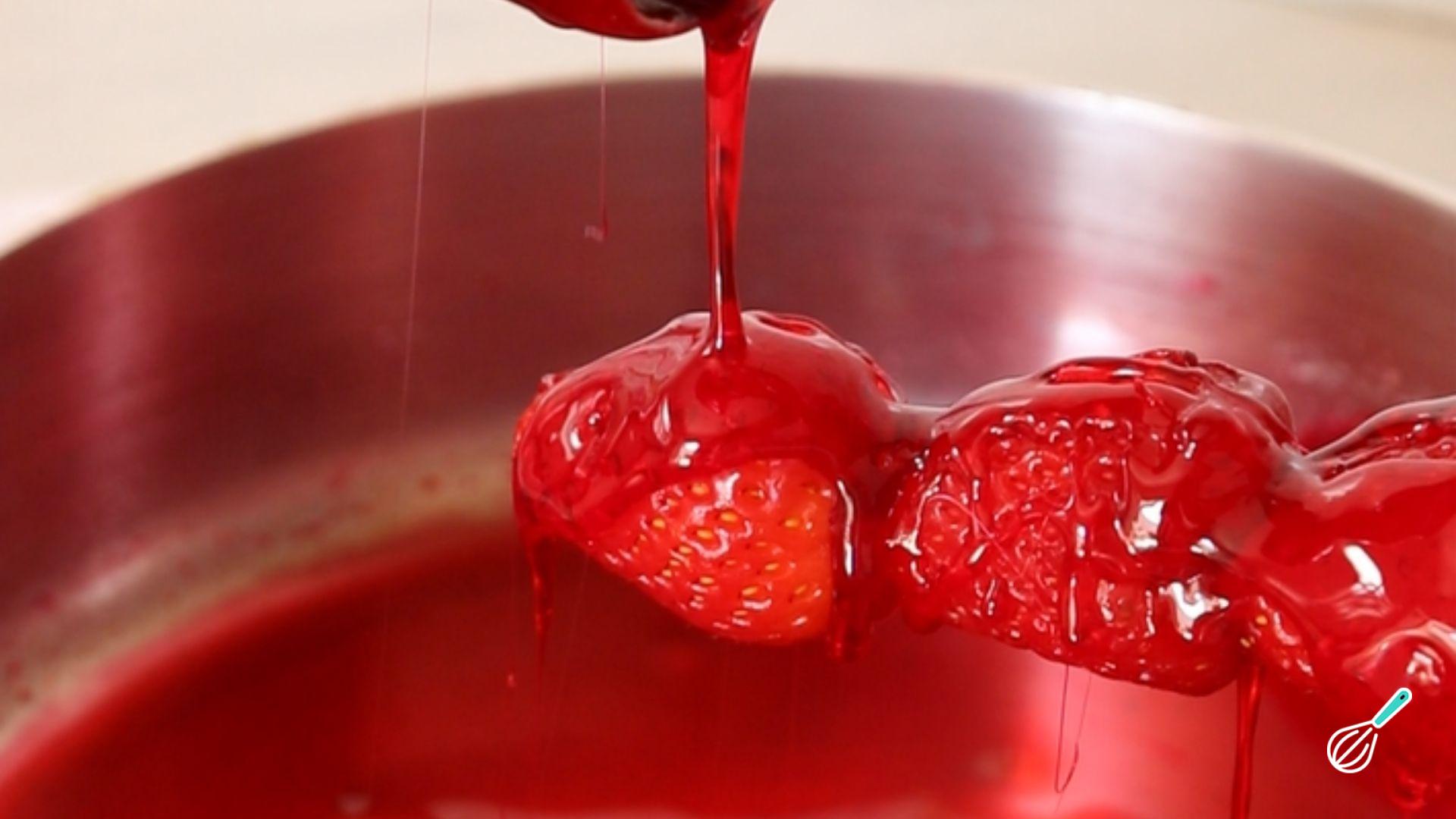Despeje a calda ainda quente nos morangos espetados no palito de churrasco. Cuidado para não se queimar.