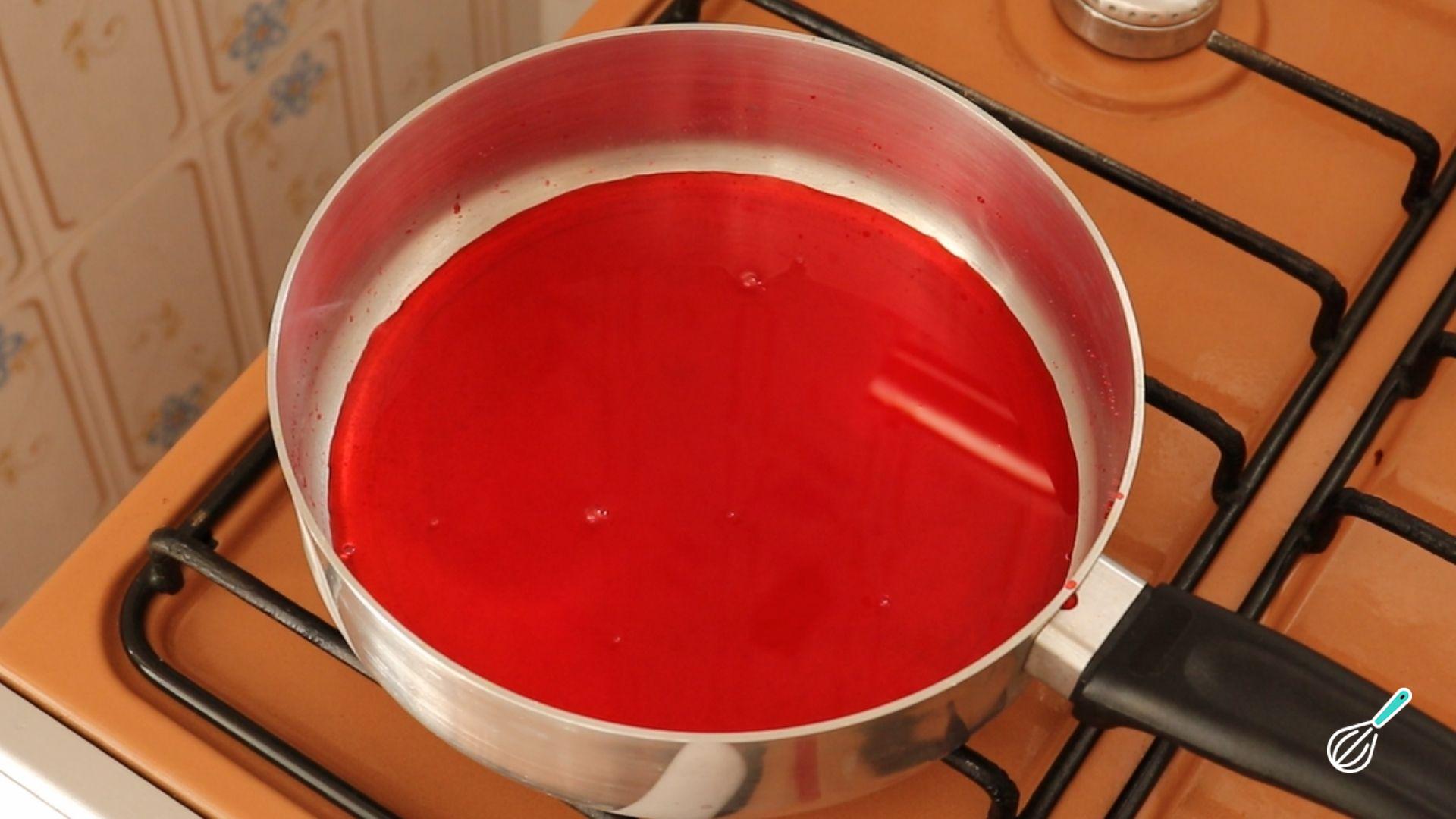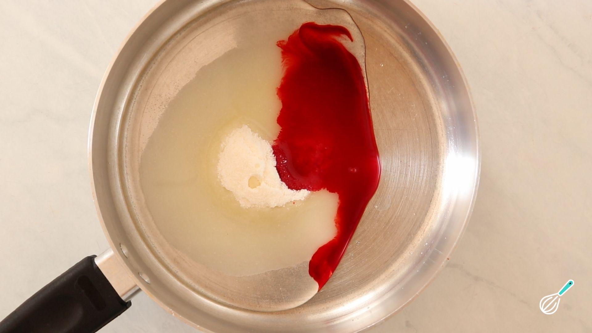 Vamos preparar agora a calda. Coloque a água, o açúcar, o vinagre e o corante em uma panela. Misture bem.