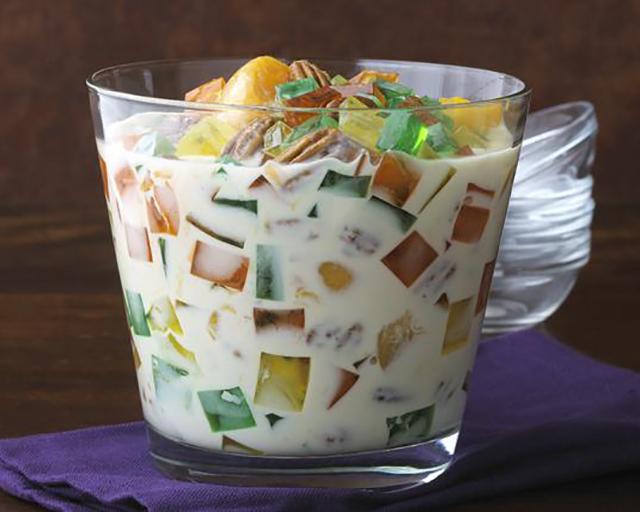 Continue lendo TudoReceitas e veja como é a preparação do mosaico de gelatina com leite condensado, uma mistura de cubinhos de gelatina com creme, pêssegos e nozes. Impossível resistir a essa combinação!