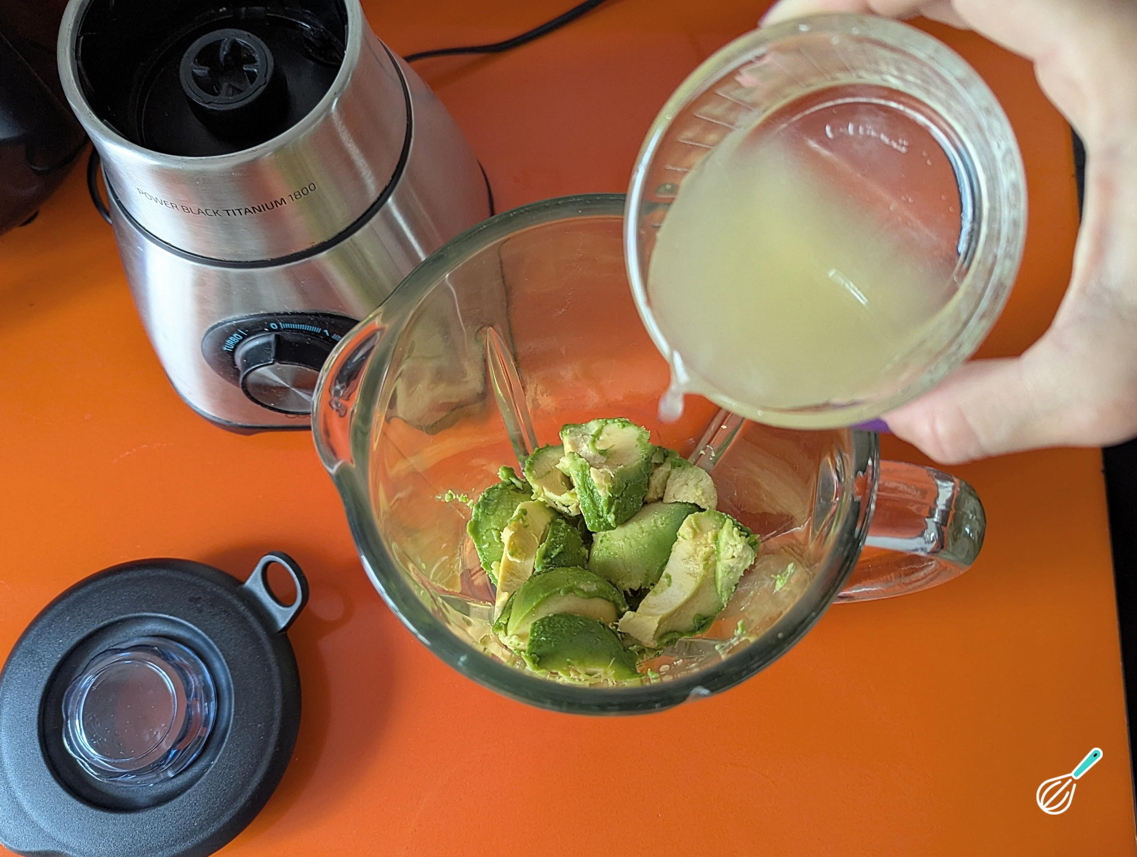 Corte os abacates ao meio e retire o caroço. Com a ajuda de uma colher, retire a polpa e coloque-a dentro do liquidificador. Esprema os limões e adicione o suco juntamente ao abacate.