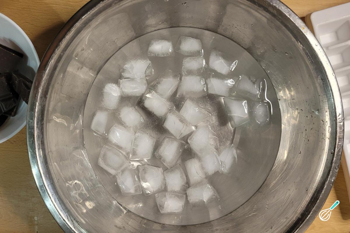 Em uma tigela grande, de preferência de inox, coloque os cubos de gelo. Coloquei também água gelada, mas pode colocar apenas os cubos de gelo. Assim o chocolate fica em contato com uma temperatura ainda menor e chega na consistência mais rápido.