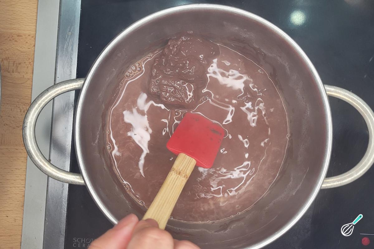 Desligue o fogo e adicione o chocolate picado, mexendo bem para que derreta.