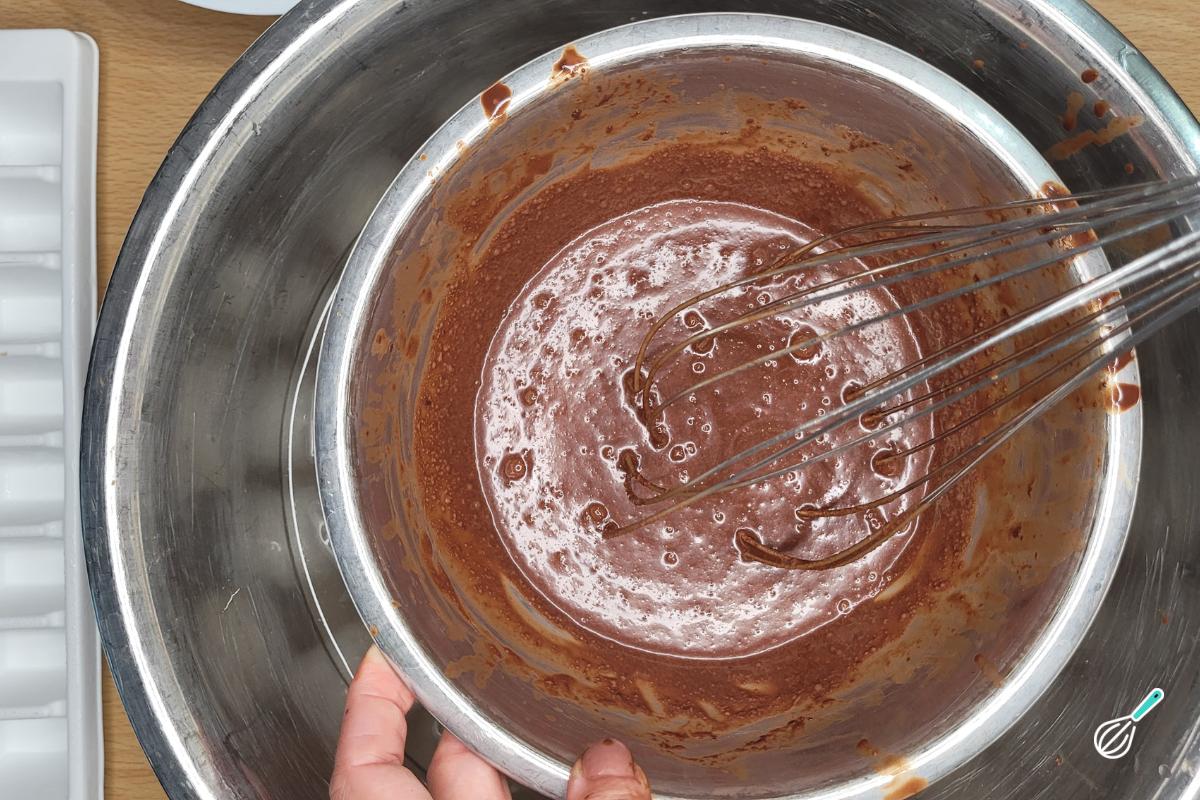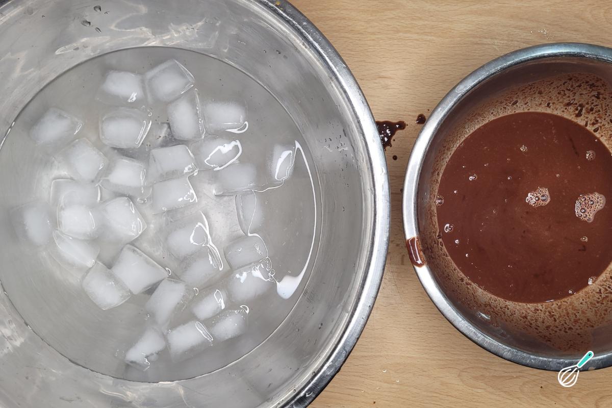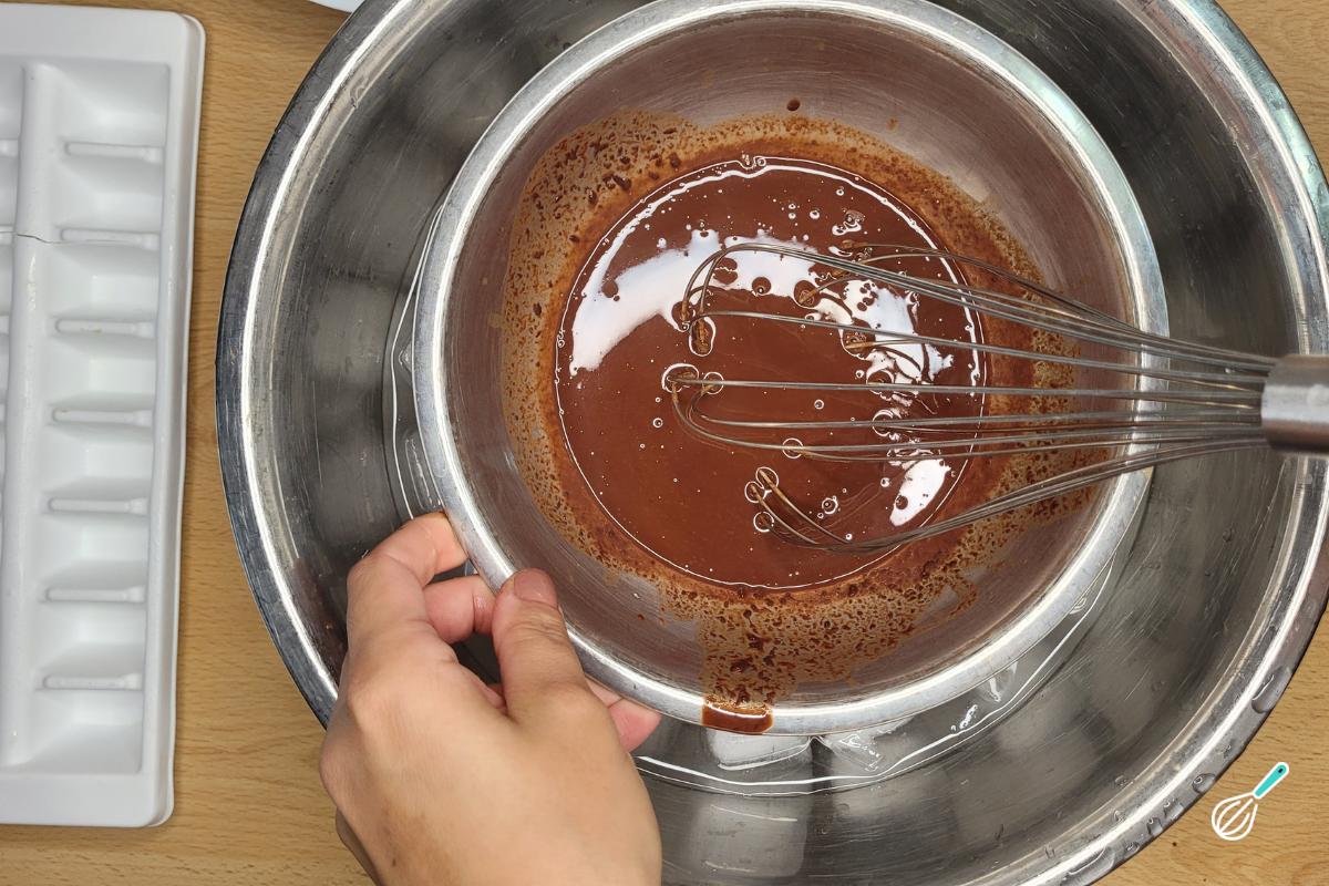 Com um batedor de arame, vá batendo bem o chocolate até que comece a engrossar e ganhar uma textura de mousse. O processo leva cerca de 5 minutos. Se tiver colocado água junto com os cubos de gelo e estiver com dificuldade de engrossar o chocolate, retire o excesso de água e se necessário coloque mais cubos de gelo e volte a encaixar a tigela do chocolate.